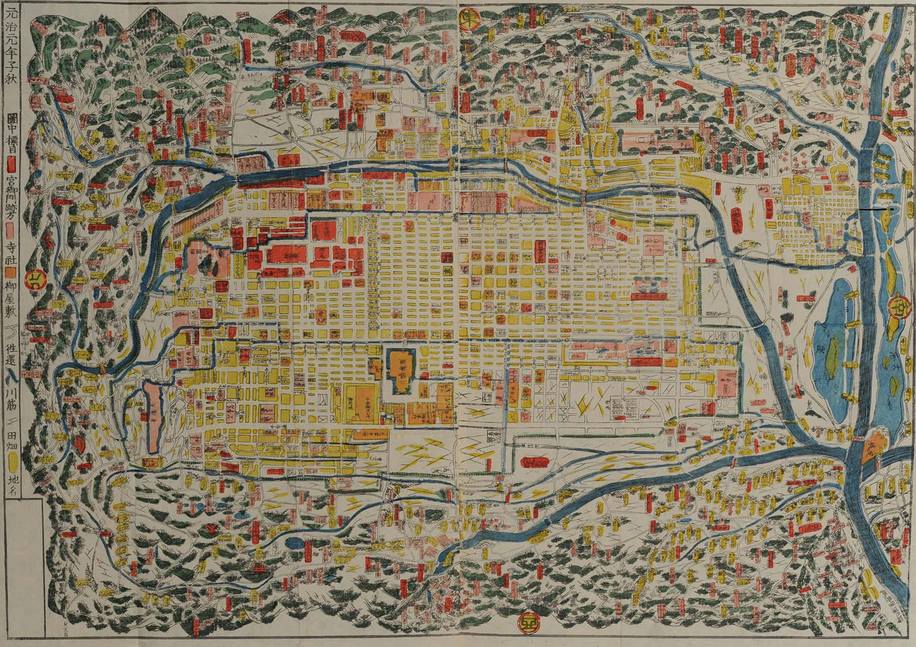 ●江戸末期の洛中洛外を描いた多色刷りの古地図「元治精選京都御絵図」には五山の送り火も表記されており、明治頃まで灯されていた「い」の送り火も確認できます。【写真3】