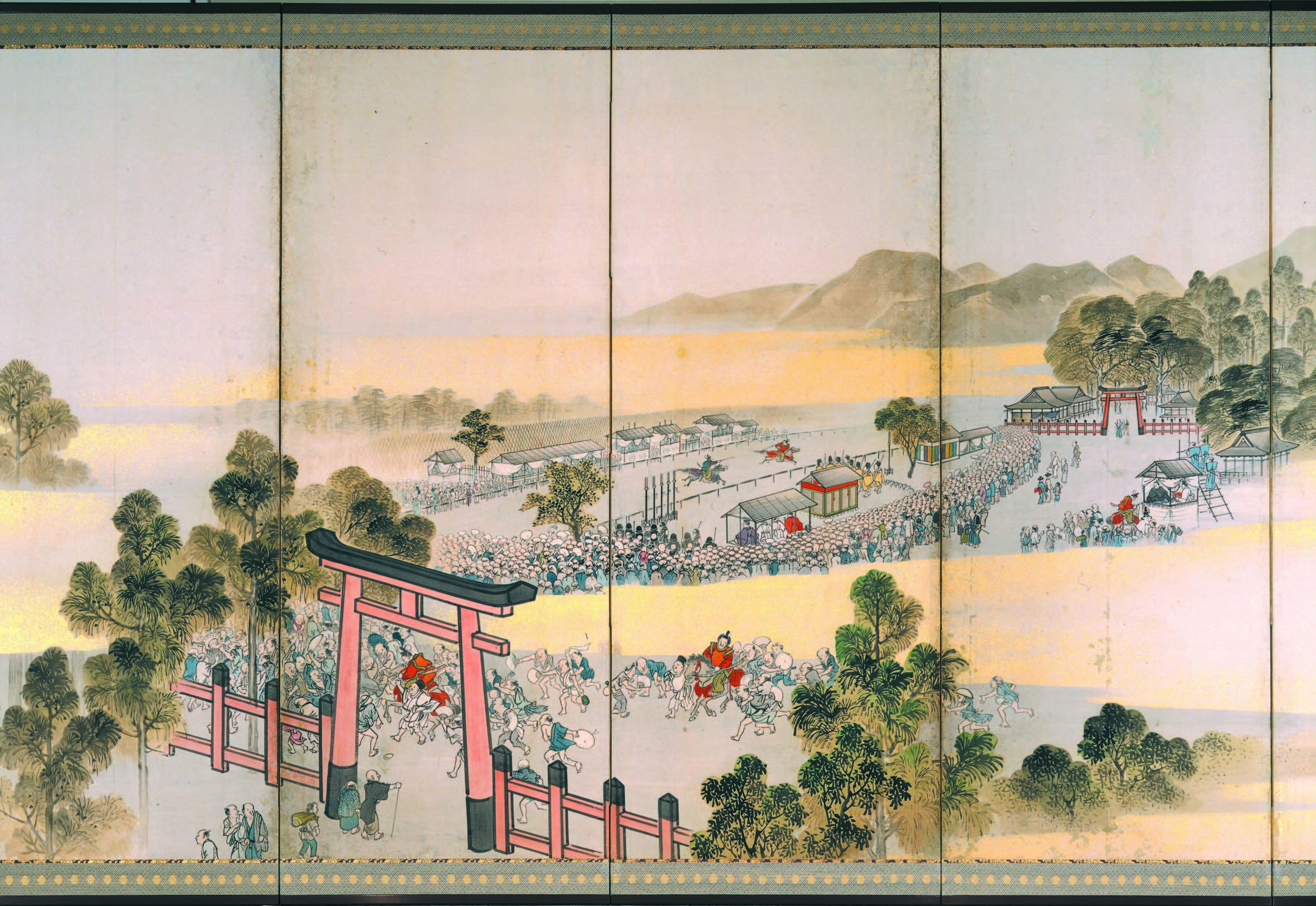 ●江戸時代後期の京都で活躍した画家・横山崋山筆「賀茂競馬図屏風」。今も上賀茂神社で行われる神事「競馬」を遠近感のある構成で、競馬を見物する人々の様子が生き生きと描いた屏風絵を約10年ぶりに公開。【写真2】