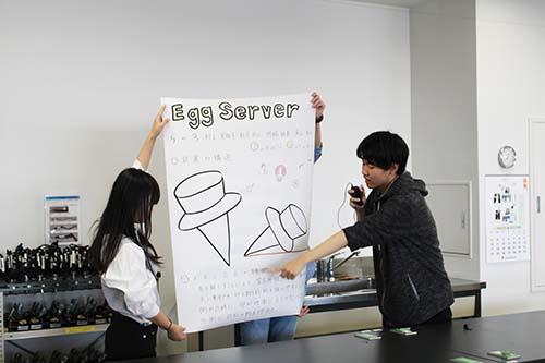 競技終了後にはプレゼンが行われ、各チームが作品の特徴や独自の工夫などを発表。そして審査を待つ間、落とした卵を使った卵料理や軽食を楽しみ、談笑しながら過ごしました。