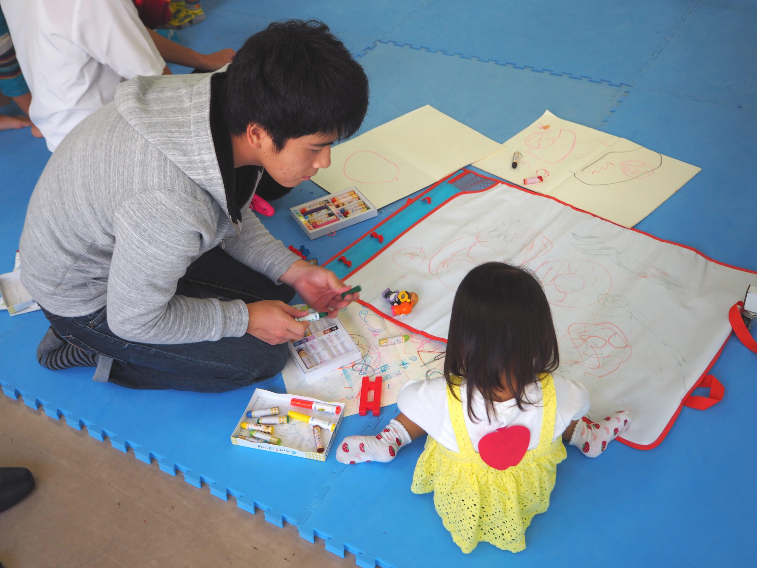 会場には子供の遊びスペースを併設し、同大学作業療法学科の学生や近隣のボランティアが対応。普段は子供から目が離せない親も、当日のセミナーの間は子供を預けることができ、同じ悩みを共有する親同士のネットワーク構築の場として活用することができる。また、学生にとっては乳幼児との接し方や、地域社会ついて学ぶ機会となる。