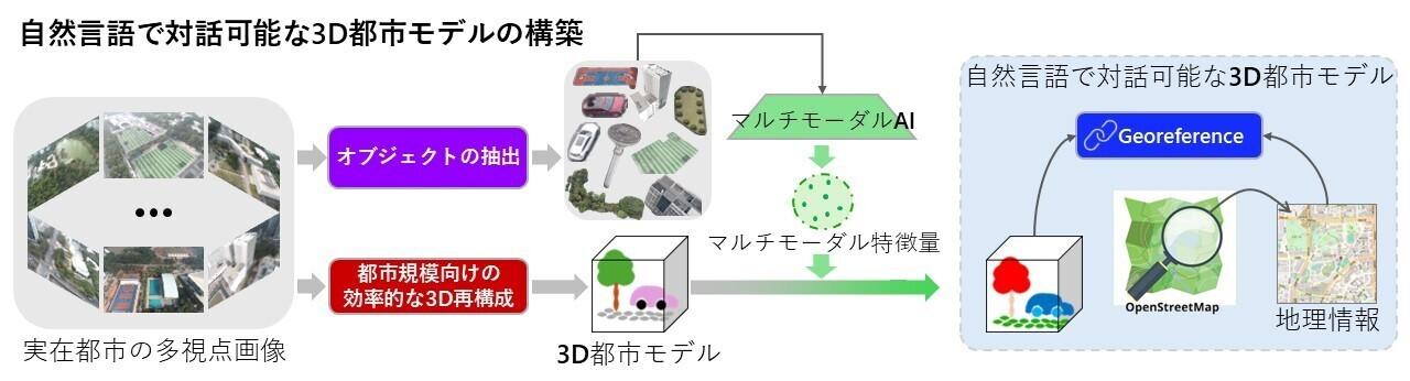 近年、3Dガウシアンスプラッティングなどの技術革新により、都市全体を非常に高精細に再現した3Dモデル(デジタルツイン)の構築が可能になってきました。これらの3Dモデルは、都市計画や自動運転のシミュレーション、災害対策など多岐にわたる応用が期待されています。しかし、この膨大な3Dデータと人間が直感的に対話し、必要な情報を引き出すことは困難でした。従来の自然言語で3D空間を扱う技術(3D言語場)は、主に室内のような小規模な環境を対象としており、都市スケールの広大なデータに対応できなかったほか、「AかつB」「Cより大きい」といった複数の要素を組み合わせた複雑な問い(構成的推論)に答える能力も不足していました。