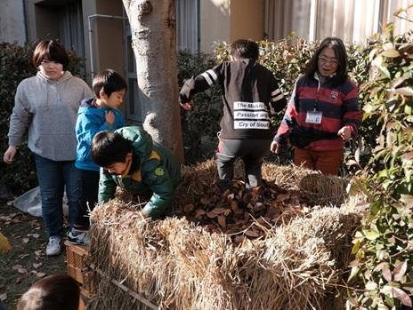 また、近隣の子どもたちに呼びかけ、ファーマーズマーケットに落ち葉を持ってきてもらい、共に腐葉土作りをしその子どもたちにおにぎり・豚汁セットのミールクーポンを配布。