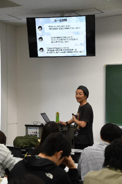 産学連携授業の初回の4月19日には、企業のビジョンとミッションを学生に説明したのち、課題を提供した。学生はこれから3カ月間、ドンドンアップを担当する広告代理店の社員に扮して、同社の販促企画を開発。5月の中間発表を経て、最終的には前期授業が終了する7月に、3つの学生チームがコンペ形式で販促企画のプレゼンテーションを行う。