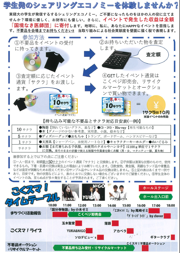 東京経済大学の小木紀親ゼミ、尾崎寛直ゼミ、学生のボランティア団体Cloverなどが中心となり、地域の皆さんを笑顔にする、国ぶんじSMILE「こくスマ!」と題して、cocobunjiプラザ開設オープニングイベントを開催する。中でも目玉は、「環境に優しく、お財布にも優しい。」を合言葉に学生発「シェアリングエコノミー」として実施する、不用品オークションとリサイクルマーケットだ。