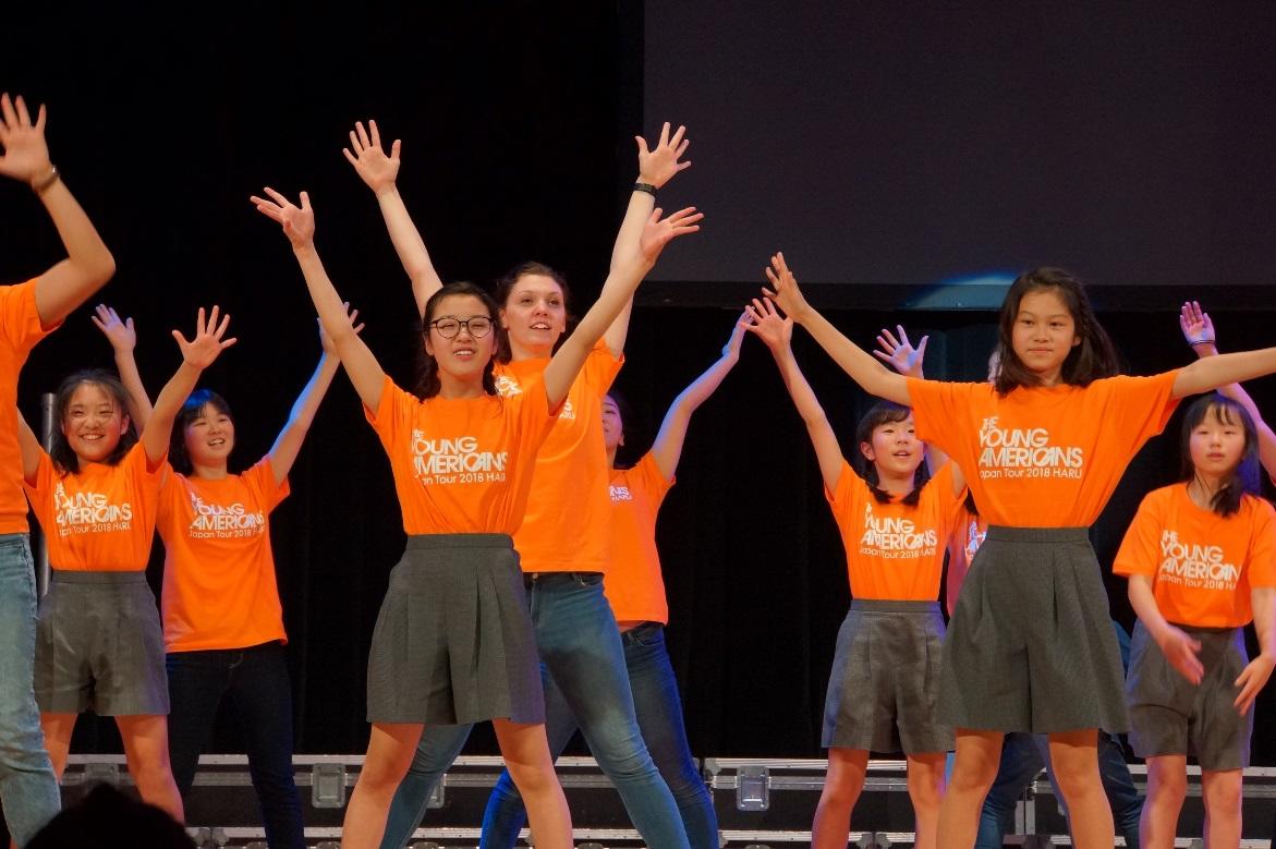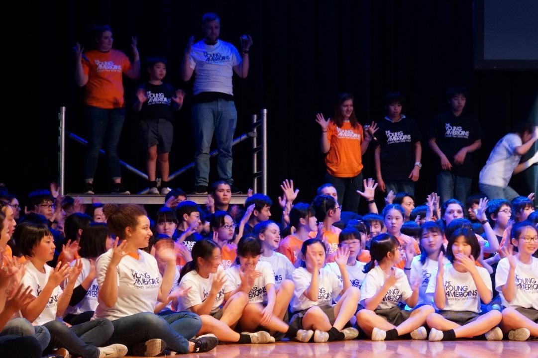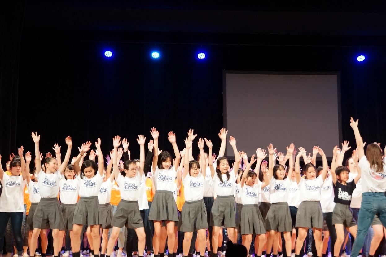 昨年の体験ワークショップが非常に好評だったことから、今年は小学5年生と中学2年生のコラボレーションで、3日間のフルワークショップを実現した。開催の随分前から当日を楽しみにしていた児童、生徒達が、3日間の練習において、自分を出し切り、輝いている姿が印象的だった。最終日には全員が見事にヤングアメリカンズの世界に引き込まれ、非常に盛り上がった(写真参照)。ワークショップの期間は、40人を超えるキャスト達を学内の児童、生徒の自宅に受け入れるホームスティも行っている。子どもたちにとって、かけがえのない体験の一つだ。