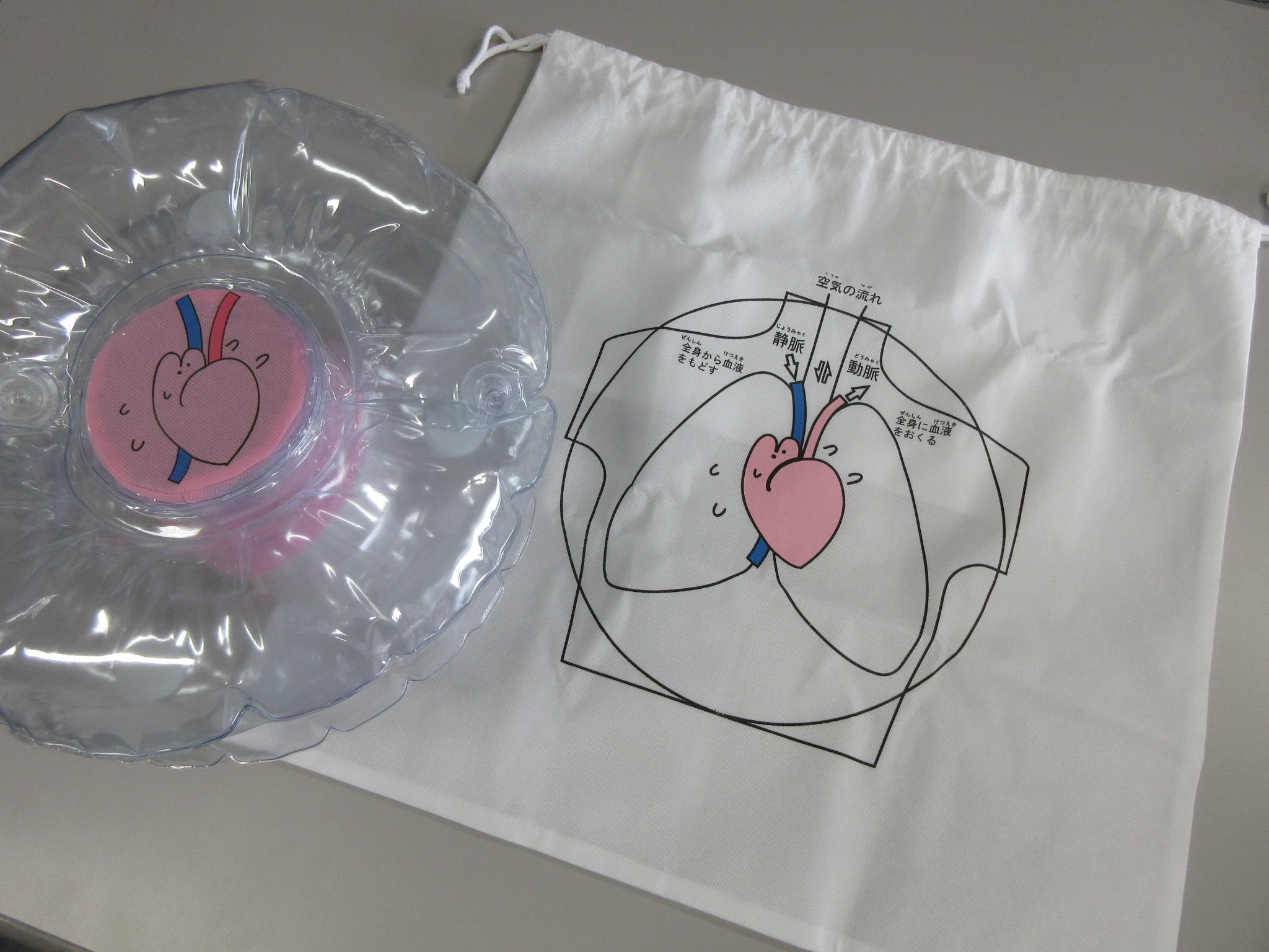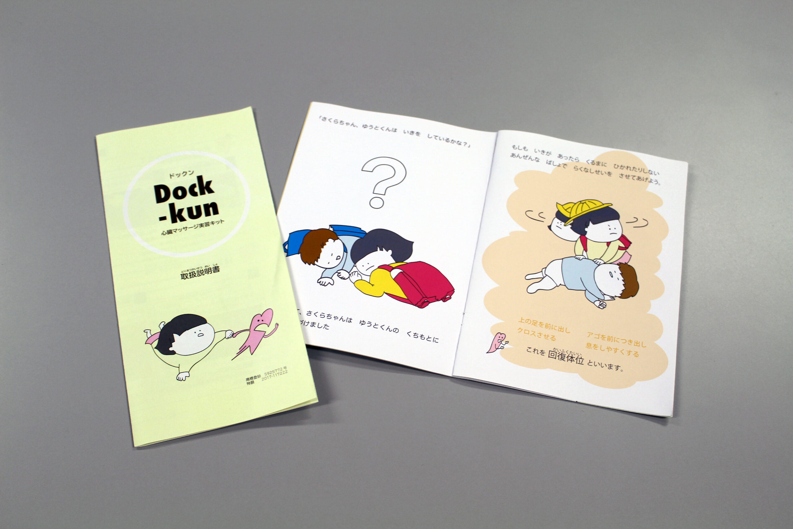 製品本体に加えて講習会用にデザインされたテキストでは、心臓の形をしたキャラクター「Dock-kun(ドックン)」が、止まってしまった心臓に外から力を加えて血液を拍出させることで、脳などの大切な臓器に酸素を送り続ける心臓マッサージについて、小中学生でも正しい知識を得ながら、楽しく実習できるようガイドしています。