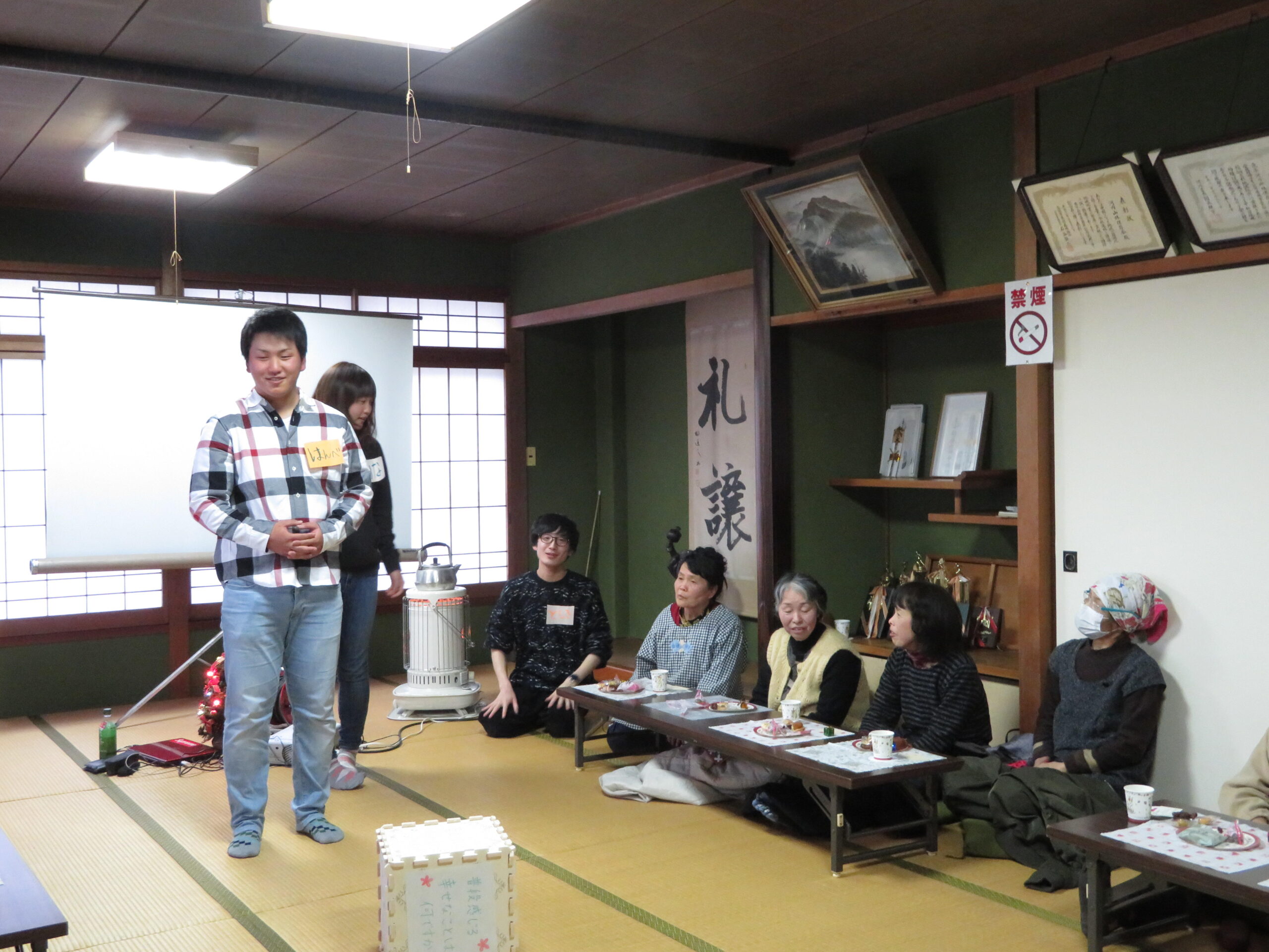 河内地区はそのほとんどが農家で、昔ながらの良さがある一方、高齢化率が50%を超えており、NPOいんしゅう鹿野まちづくり協議会等が地域づくりに奮闘しています。そこへ学生たちが、新しい風を吹かせるべく地域づくりに熱心に取り組んでいます。これまで活動に参加するのは男性ばかりで女性の意見を聞く機会がなく、地域づくりにおいては女性目線も大事にしたいと考え、「女子会」を開くことを提案。第1回目は大雪にもかかわらず10名もの女性たちが集まって楽しいひと時を過ごすことができました。第2回目の今回は、学生たちが大阪ならではのお雑煮も振る舞い、「お雑煮対決」を実施する予定。これからの地域づくりに、地域住民全員が自然な形で参画してもらうためのきっかけとしての大切なイベントと位置づけています。