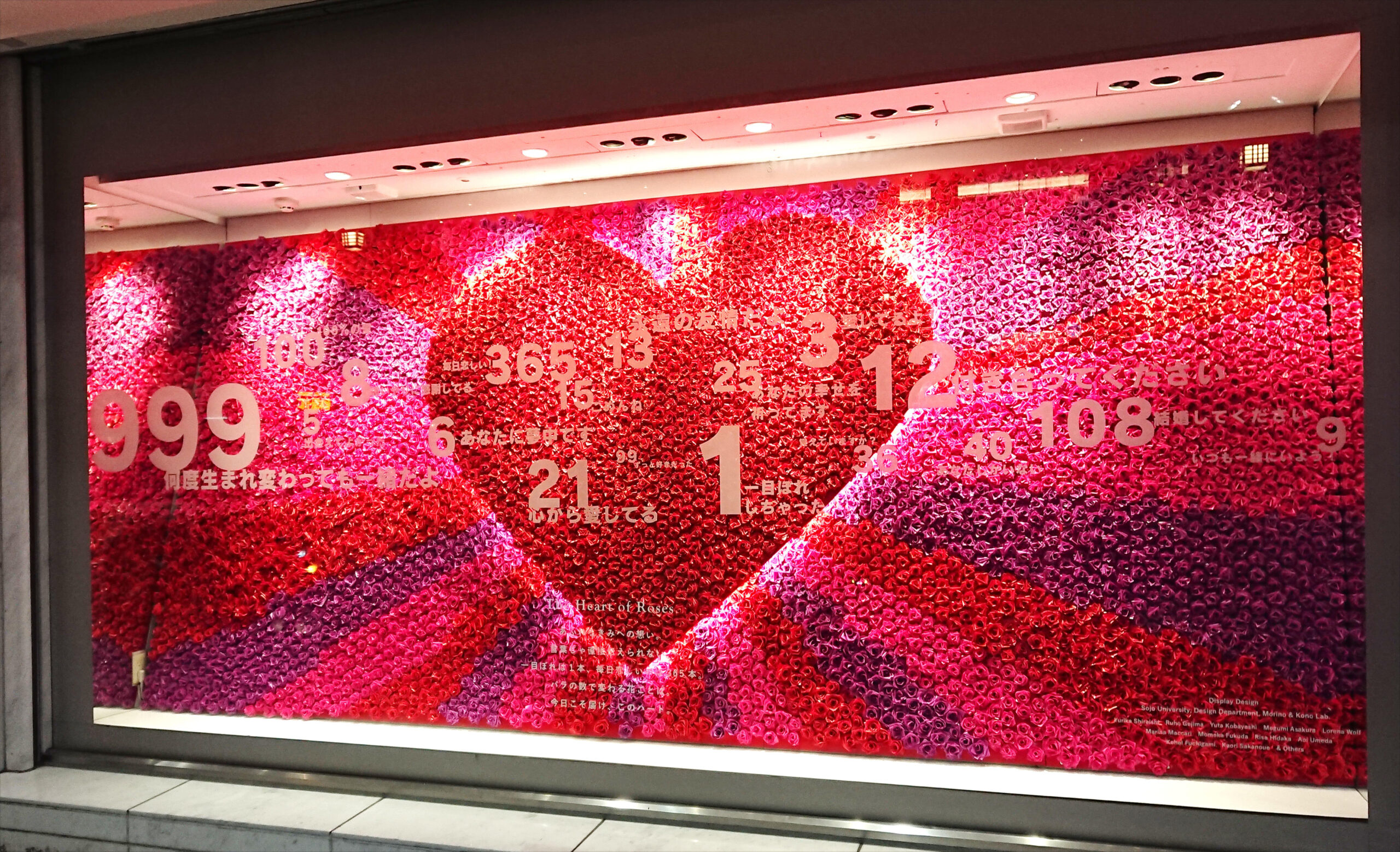 今回の作品は「The Heart of Roses」。昨年11月から学生同士でアイデアを出し合い、準備を進めてきた。縦2.1m、横4.5mのパネルにカッティングシートでひとつひとつ作製した造花のバラを4350個並べ、真っ赤なハートを描いた。ガラス部分には、贈る本数によって異なるというバラの花言葉を表し、赤を基調に紫やピンクで彩られた艶やかで個性的な作品が完成した。