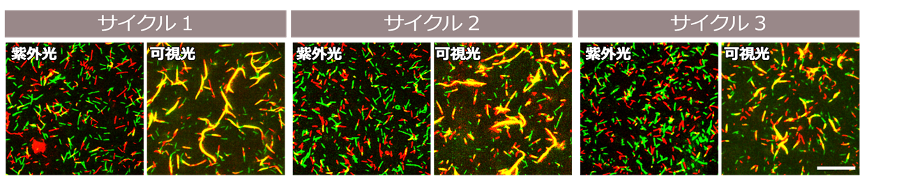 *4 光を感知する色素(感光性分子)… 光をあてると色や構造が変わり、また別の波長の光をあてることで元の色・構造に戻すことができるような有機材料のこと。本研究では感光性分子として、可視光で平面形態(トランス体)、紫外光で屈曲形態(シス体)となるアゾベンゼンを使用した。