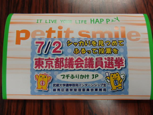 インターンシップ生が若者目線で選挙啓発グッズ、「ふりかけ」と「ポケットティッシュ」を制作。「ふりかけ」は「シャカシャカとご飯にふりかける」という意味をかけて、「シャカいを見つめてふるって投票を」というキャッチコピーを添えて、武蔵大学食堂や近隣の日本大学芸術学部の学生食堂で配布しました。また、ポケットティッシュは、18歳選挙権を意識して18禁マークを用いたデザインのものも作成し、西武池袋線江古田駅周辺で街頭啓発活動を行いました。