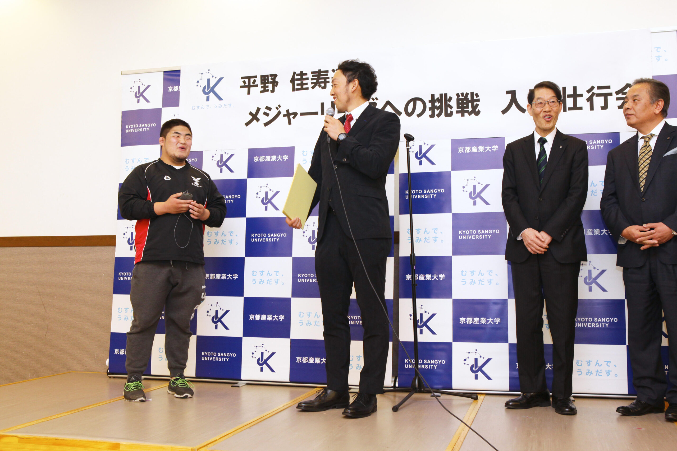 平野投手は「ダイヤモンドバックスへの入団が決まり、これから世界で頑張ります。大学での4年間は野球だけでなく学業も頑張り、その成果が今に繋がっています。京都産業大学のことを誇りに思っていますし、母校を世界でアピールをしていきたい。在学生の皆さんも誇りをもって、世界に羽ばたいていってほしい」と語った。また、壮行会に参加した学生から、メジャーリーグ1年目の目標について尋ねられると「シーズンを通して60、70試合投げたい。優勝を狙えるチームなので、優勝して皆さんに良い報告をしたい」と答えた。