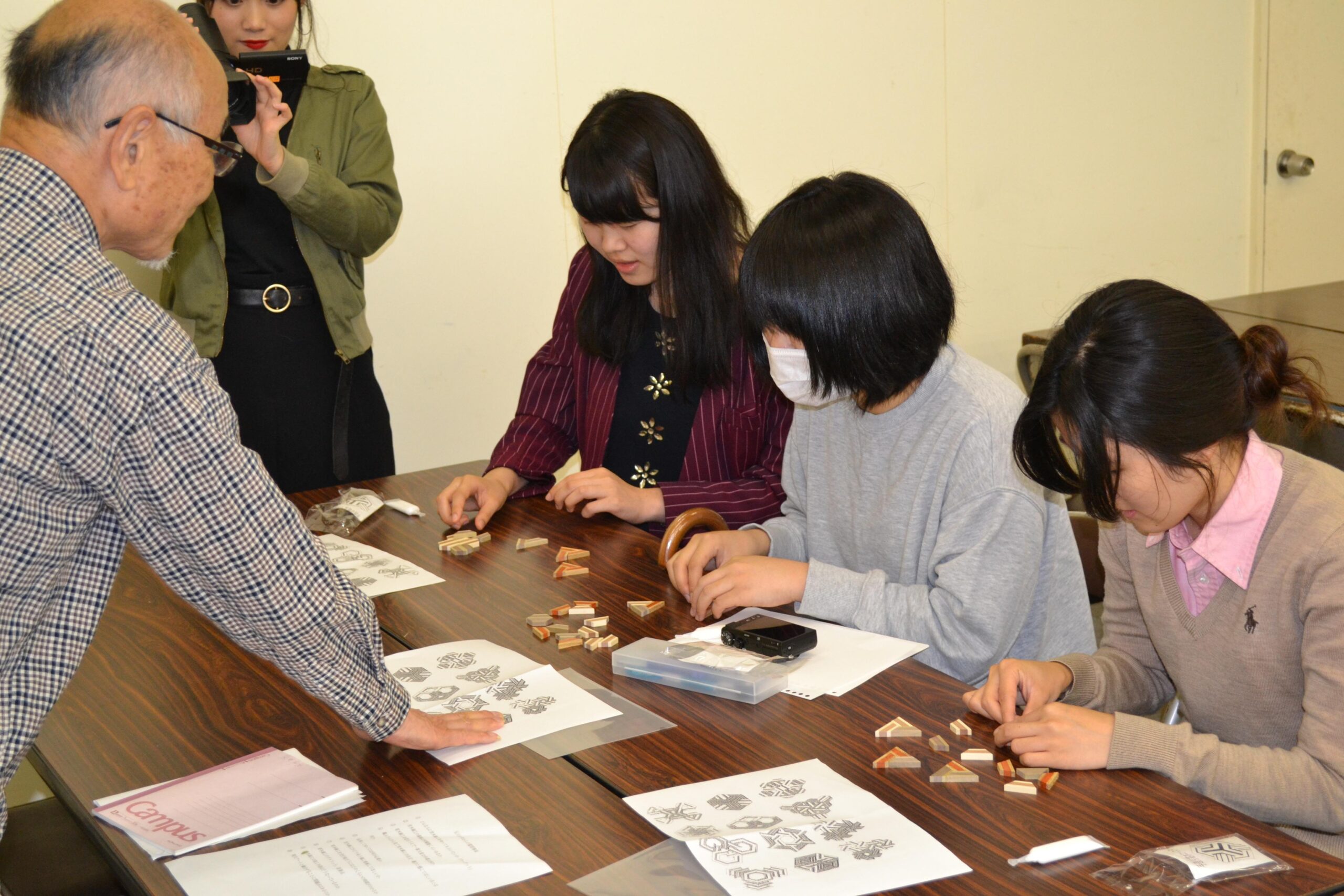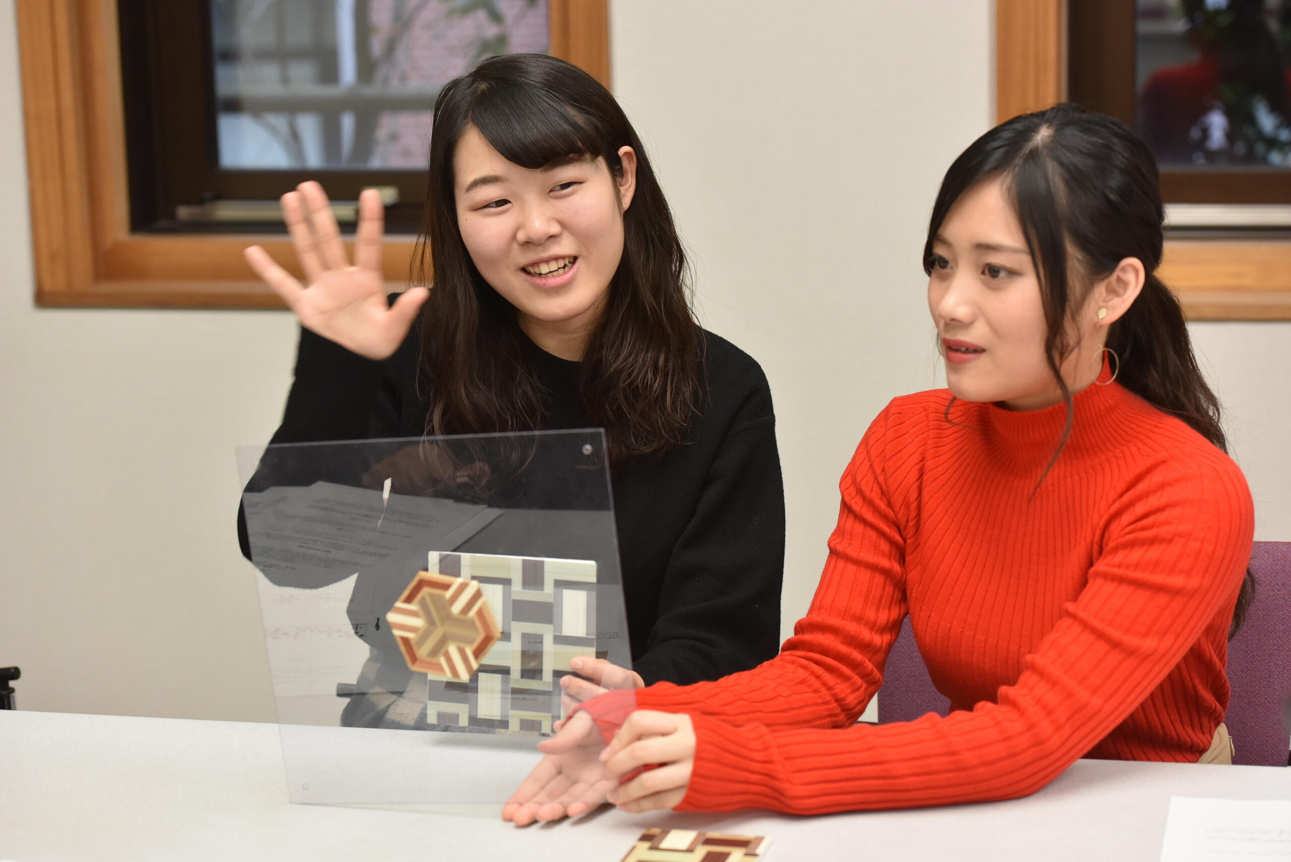 こうした企画・制作活動は、基本的には学生全員で進めているが、その中でも小田千裕(おだちひろ)さんはリーフレットのデザイン制作を、新川晃子(にいかわあきこ)さんは期間中の1月20日に行われる寄木細工のワークショップの企画を主に担当している。