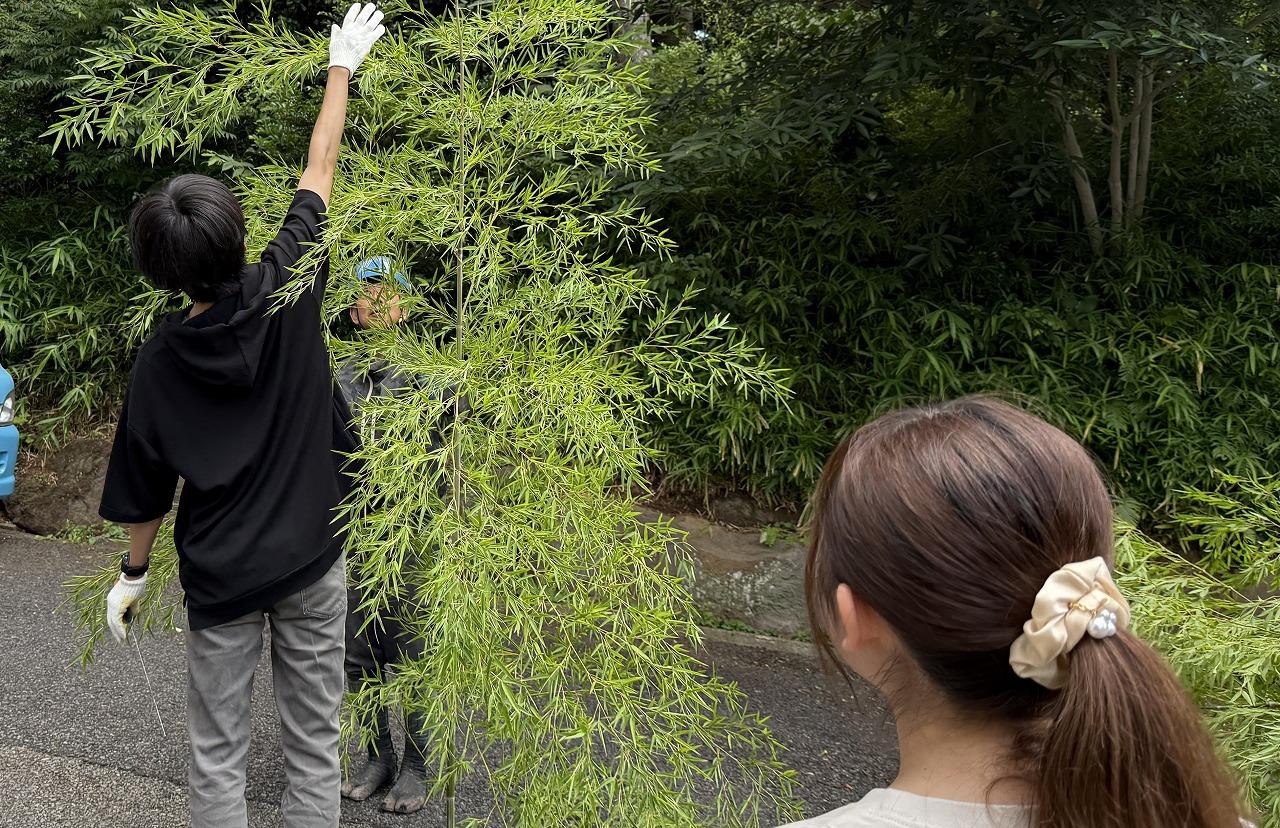 今年度の取り組みは2025年5月から検討を開始。昨年度の活動を踏まえ、竹の長さを調整して上部まで短冊をつけられるようにし、短冊のサイズもコンパクトにするなど、多くの来場者が自由に願いを書いて吊るせるよう、細やかな工夫が重ねられています。学生たちはそのために、約3,000枚の短冊を準備しました。6月27日には学生たちがキャンパス内で竹を伐採し、その後、笹飾りの取り付けや短冊の設置をしました。