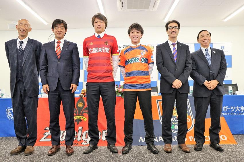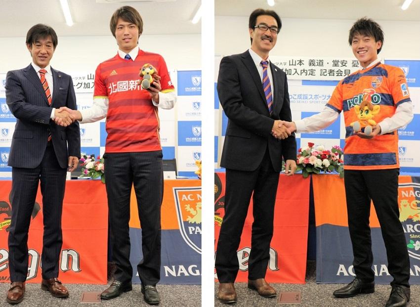 びわこ成蹊スポーツ大学(滋賀県大津市)男子サッカー部の山本義道(やまもと・のりみち)選手と堂安憂(どうあん・ゆう)選手はこのたび、Jリーグチームに加入することが内定した。山本選手はツエーゲン金沢(J2)に、堂安選手はAC長野パルセイロ(J3)にそれぞれ来季から加入する。両選手の加入内定に伴い、11月20日に同大で共同記者会見を開催した。