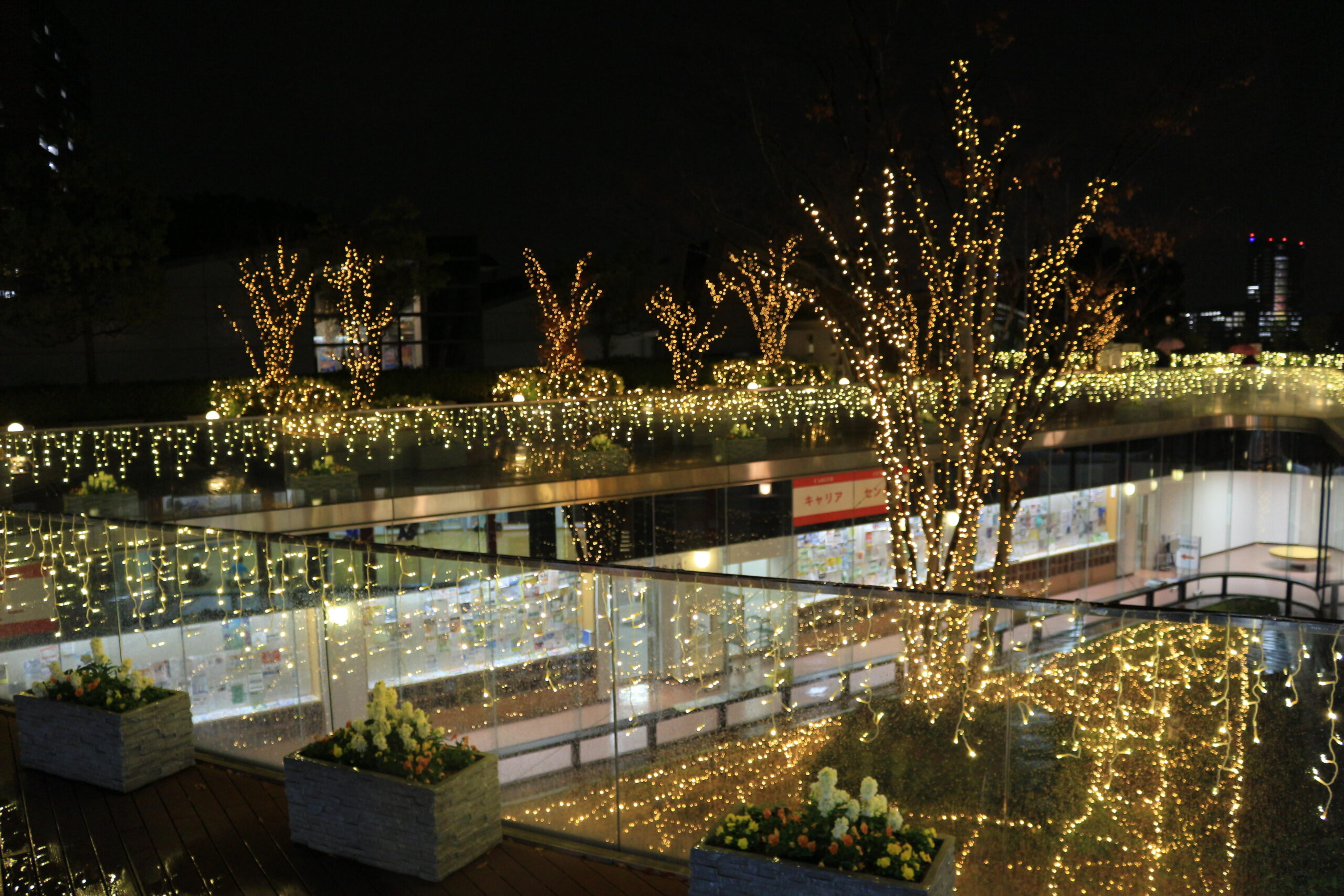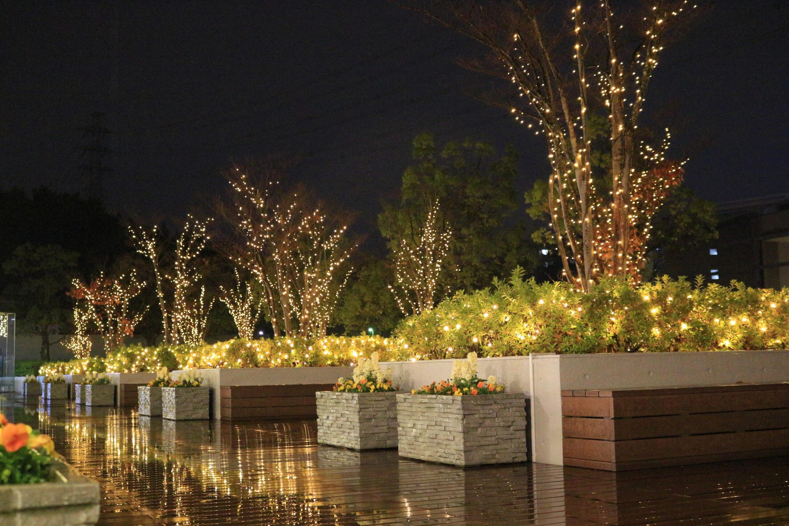 イルミネーションの設置場所は、多くの方が行き来する、駅直結のモノレール口からすぐの「グリーンテラス」と「白門プロムナード」です。登下校する学生や来校者をお迎えし、また、お送りする場所のため、心が和み、ほのぼのとした気持ちになれるよう、温かいシャンパンゴールドの明かりを灯しました。