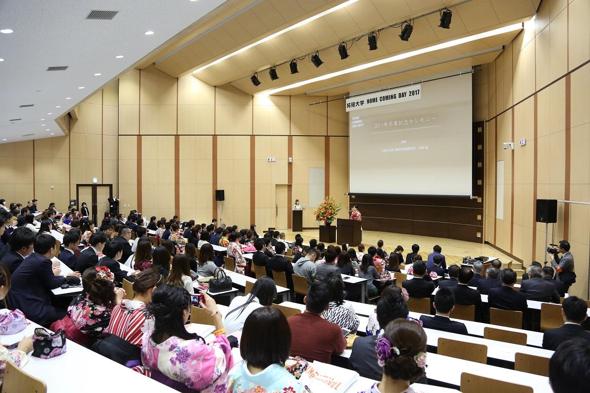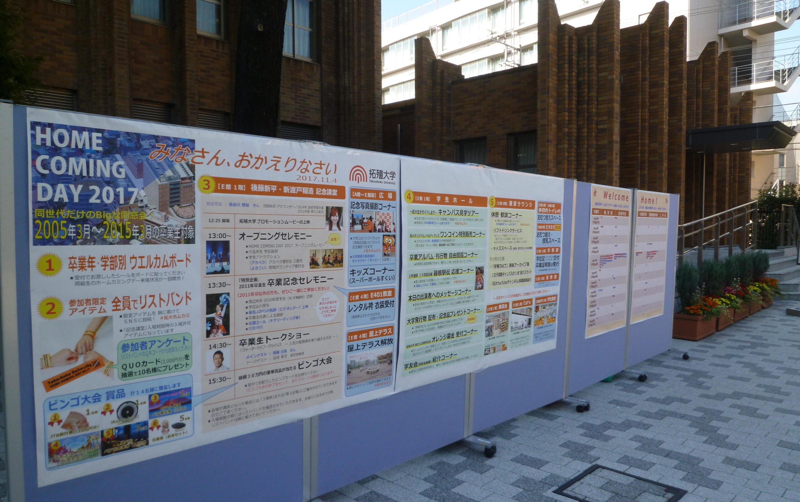 「拓殖大学ホームカミングデー2017」は総合司会に四国放送アナウンサー・長谷川朋加さん(2014年政経学部卒業)を迎え、トークショー企画では招待対象者である20代後半~30代半ばのクオーターライフ・クライシス世代に向けた「人生の転換期を乗り越える方法」について、須藤元気さん(2012年大学院地方政治行政研究科修了)らがトークゲストとして登壇し、ポジティブな考え方・生き方を語った。卒業記念セレモニーの企画では、お笑いタレント・流れ星の「ちゅうえい」さん(2003年商学部卒業)や八重樫東さん(2005年政経学部卒業)からのビデオレターも披露された。学生団体による「アカペラ」のハーモニー、力強い「よさこい」の舞、チアリーディング部による「応援エール」などのアトラクションが華を添え、フィナーレを飾るビンゴ大会で会場は沸きかえった。