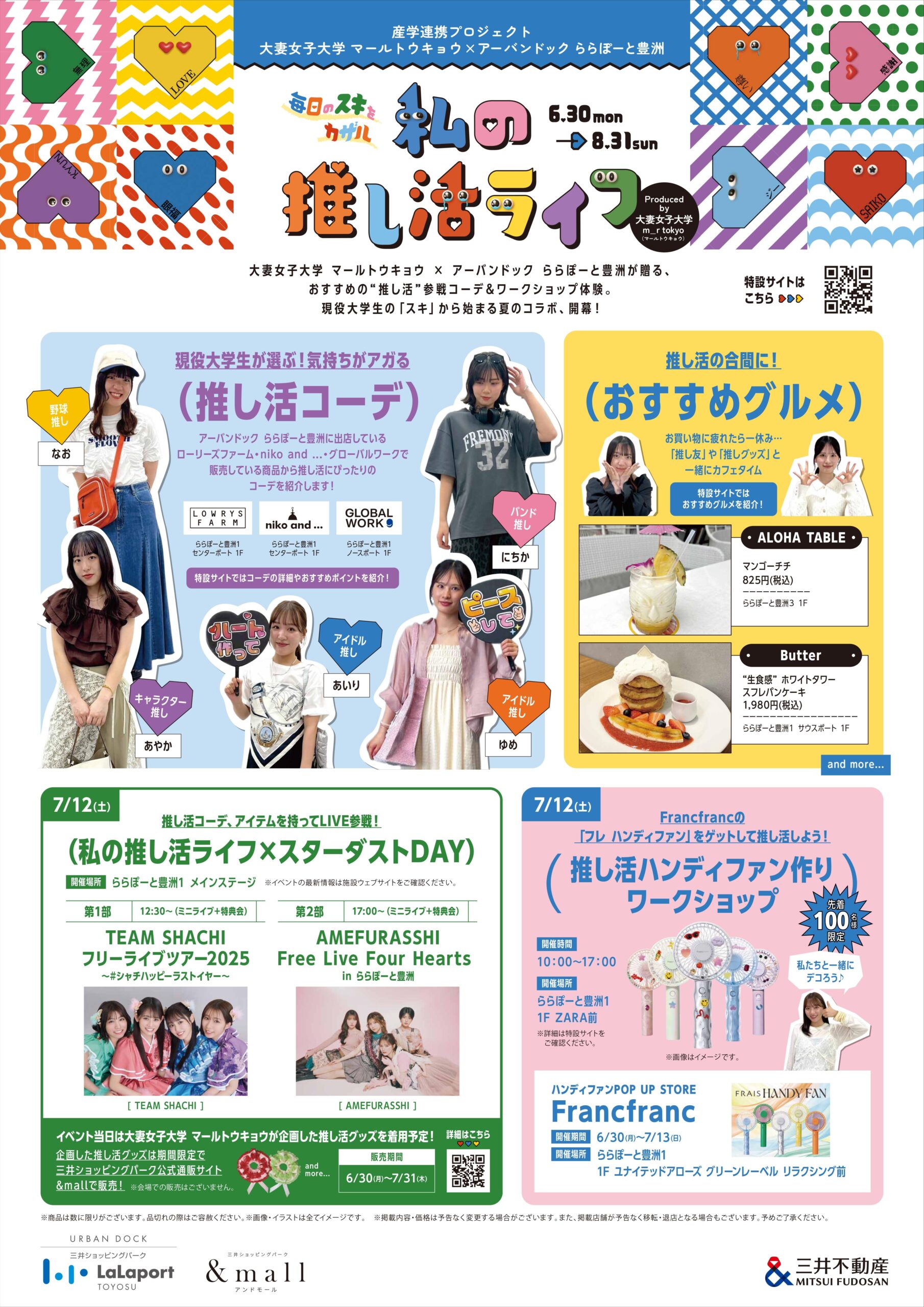 今回のプロジェクトでは、「アーバンドック ららぽーと豊洲」、「アダストリア」の各ブランド、インテリアブランド「Francfranc」などとコラボし、現役大学生による”推し活”におすすめのコーデ特集を特設サイトで紹介。また、「Francfranc」とタイアップしたワークショップやPOP UP STOREなどを開催するほか、「m_r tokyo」が企画したグッズを着用予定の女性グループ(「TEAM SHACHI」「AMEFURASSHI」)によるライブイベントも行われる。イベントの合間に一休みできるオススメスポットも学生目線で紹介中!概要は以下のとおり。