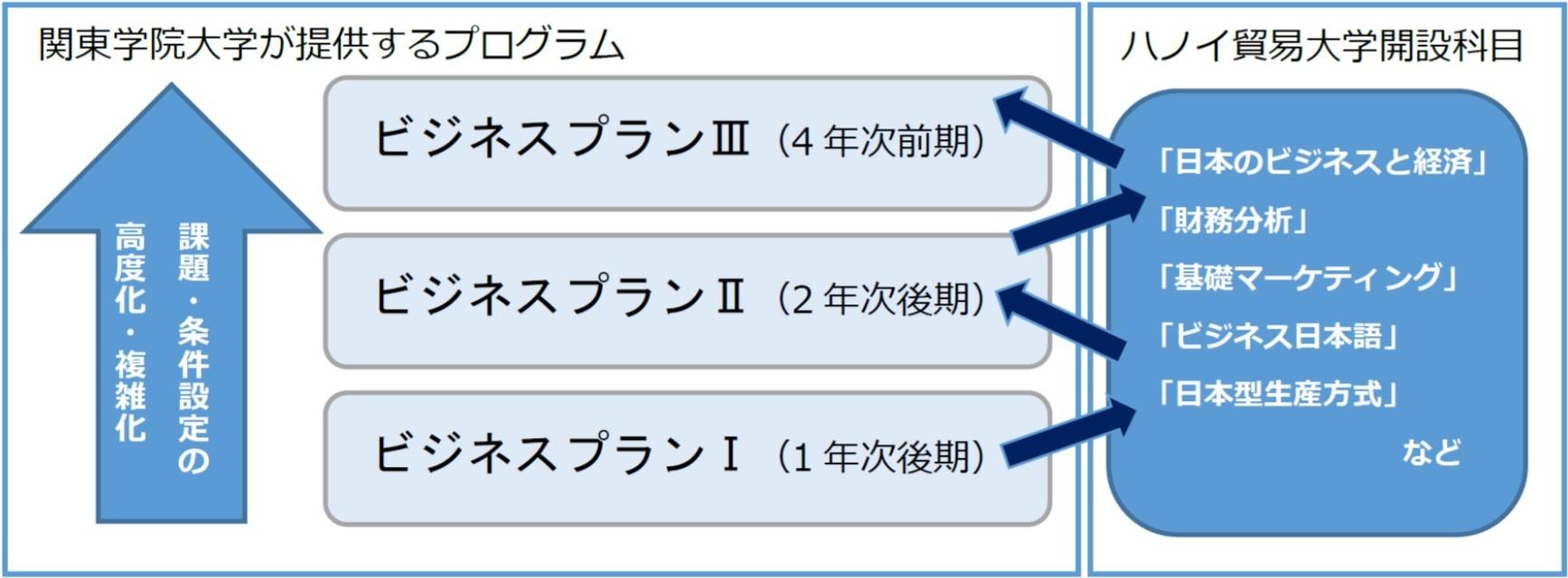 今回、ハノイ貿易大学に提供する講座「ビジネスプラン」では、実企業の課題をテーマに、学生たちがグループワークによるビジネスプランの企画から提案までを実践的に学修します。「ビジネスプラン」は、ハノイ貿易大学が開設する科目とも連携しつつ、学年が進行するとともに課題や条件を複雑化・高度化させ、実際のビジネスの現場で活躍できる人材の育成をめざします。