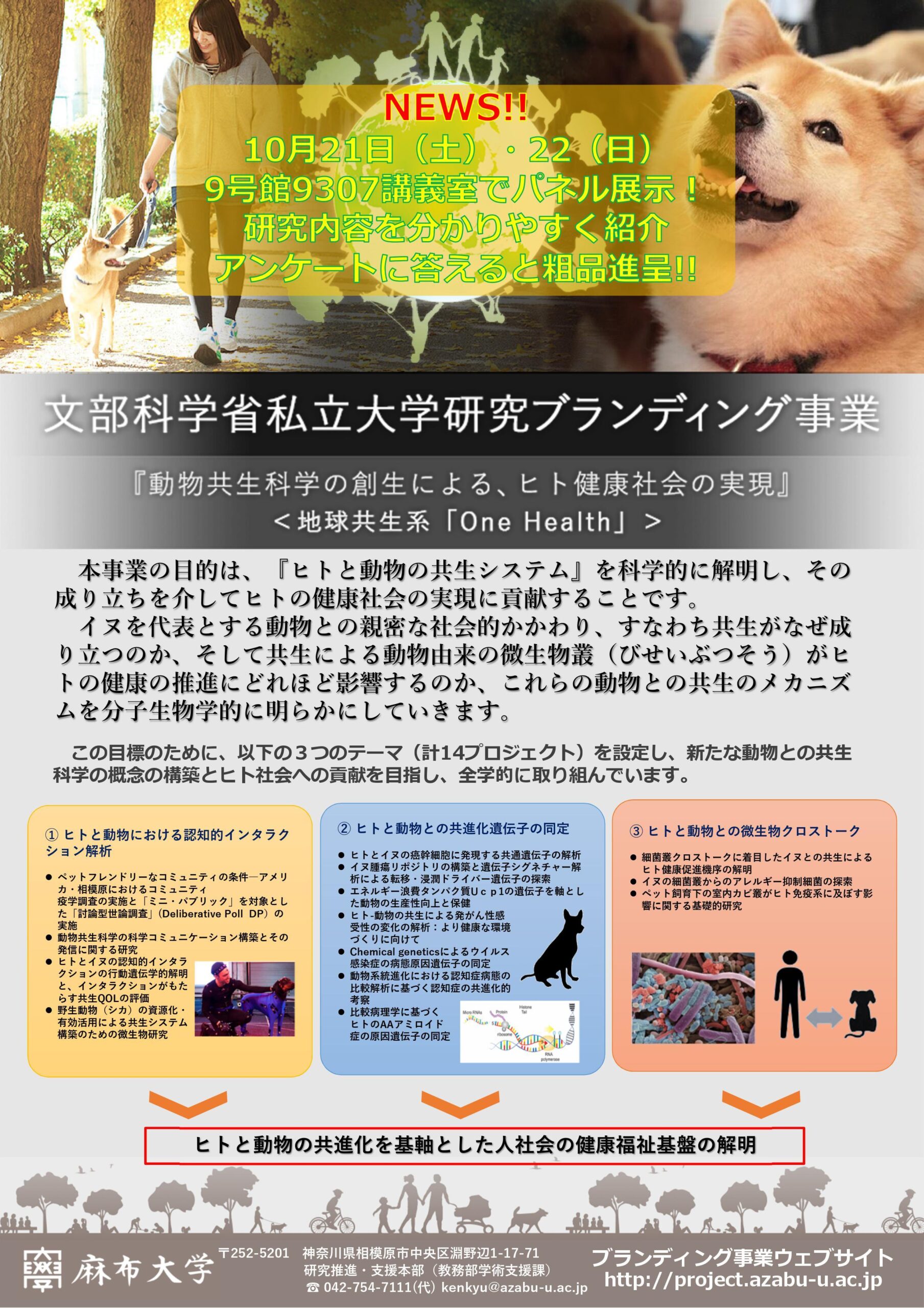 10月21日(土)22日(日)に、麻布大学では、文部科学省私立大学研究ブランディング事業「動物共生科学の創生による、ヒト健康社会の実現」の研究内容のパネル展示を開催します。本事業は、「ヒトと動物の共生システム」を科学的に解明することを目的とした、学部・学科を超えた研究プロジェクトです。当日は大学祭も開催しておりますので、お気軽にお立ち寄りください。