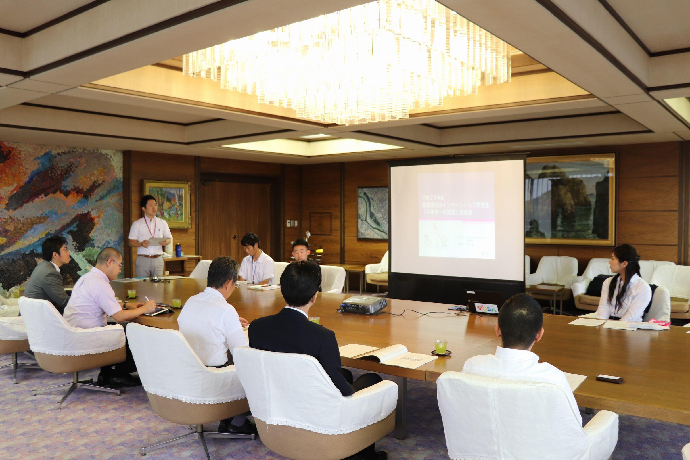 実習生はそれぞれが考えた提言内容をレポートにまとめ、実習最終日の9月20日に「戸田市への提言」として、神保国男市長ら関係者に1人ずつ発表。パワーポイントを使って10分程度で提言の要点を説明し、市長をはじめとする出席者からの質問に答えた。