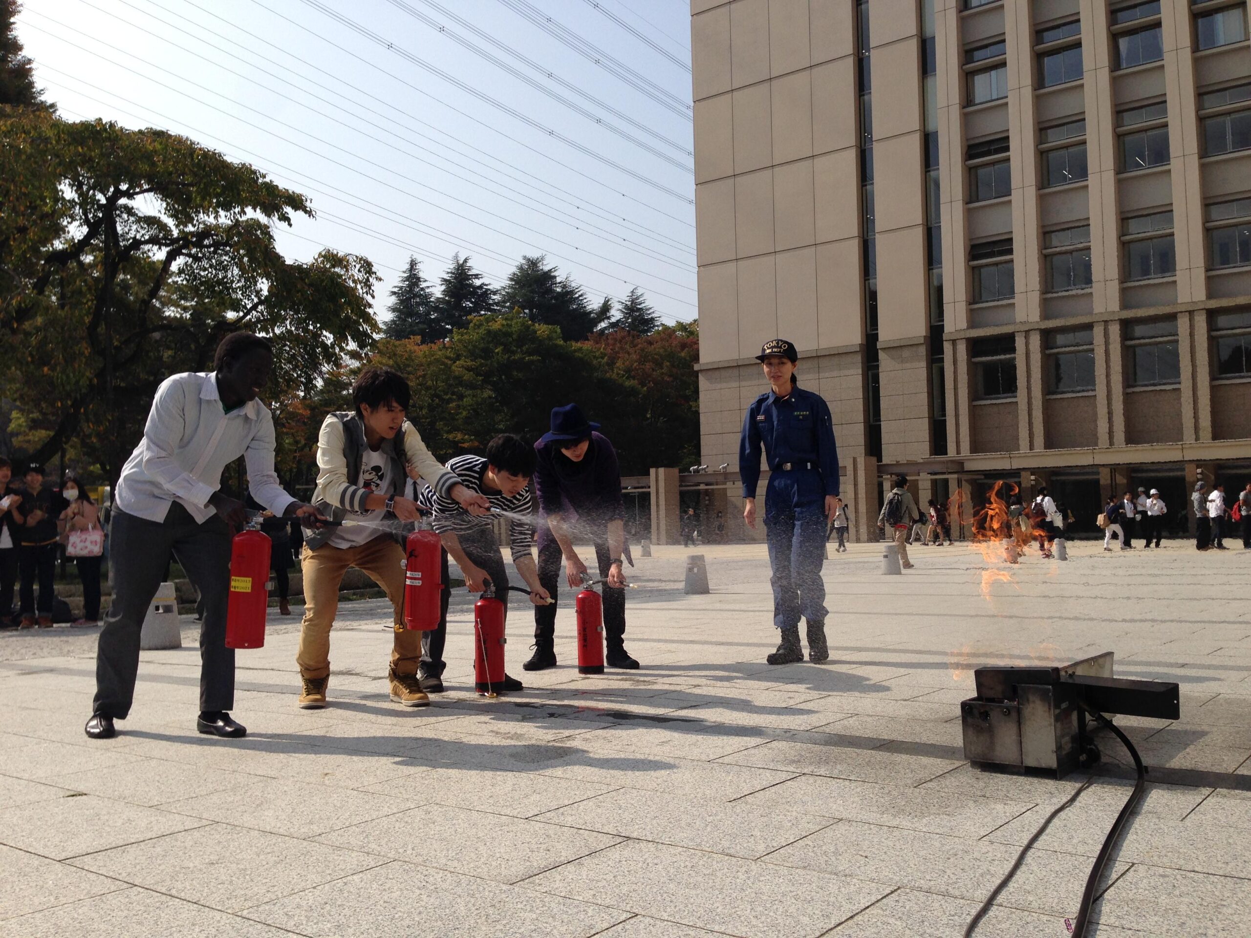 「授業中に首都直下型地震が発生し、八王子市で震度6弱の揺れを観測した」ことを想定して、自己防衛、通報連絡、情報収集、安否確認を行い、各棟周辺には「一時避難所」を定め、避難誘導の訓練も行う。