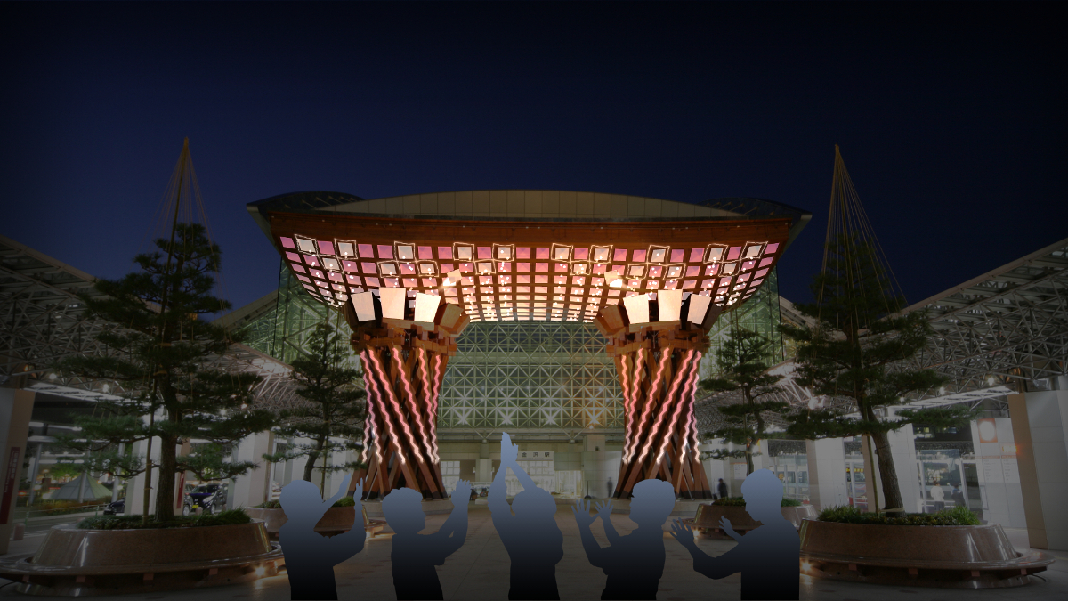 今回は「伝承」をテーマとした鑑賞型プロジェクションマッピングと、「鼓動」をテーマとした参加型プロジェクションマッピングの2構成で、交流拠点都市金沢の玄関を彩る。