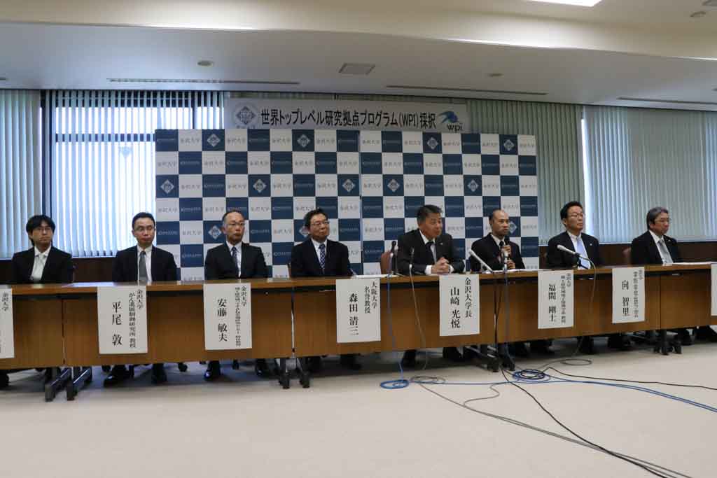 採択を受け、9月26日に角間キャンパスで記者会見を実施。金沢大学の山崎光悦学長と向智里理事(総括・改革・研究・財務担当)、福森義宏理事(企画評価・情報・社会貢献担当)、福間剛士理工研究域電子情報学系教授、大阪大学の森田清三名誉教授らが出席した。
