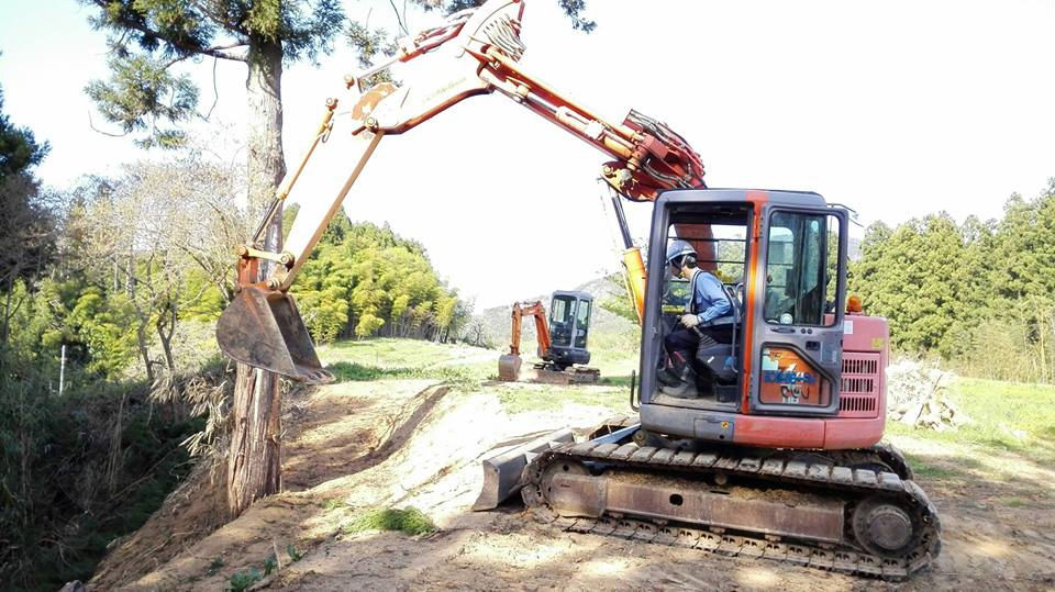 丘陵地へのアクセス用道路の整備のため伐採を行った。NPO 法人再生の里ヤルキタウン理事長熊谷耕太郎さんより工具使用の講習を受け、車両系建設機械の資格を取得している学生が重機を動かしている。伐採した木材は建築に使用する。
