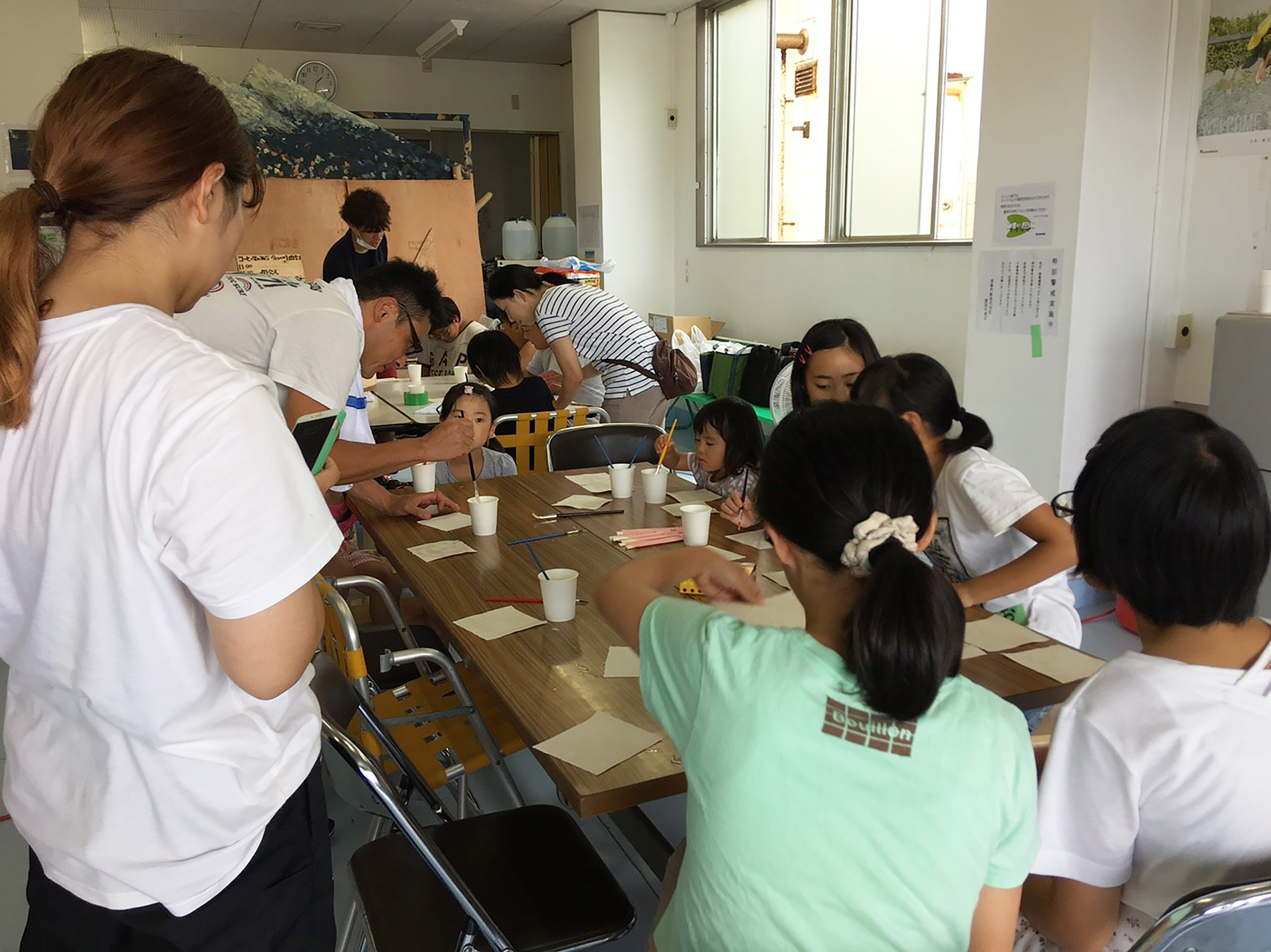 8月18日、昨年度改修を行った東海汽船事務所1階にて、この建物とものづくりを身近に感じて欲しいという目的で地域の子どもたち向けにコーヒー染めワークショップを実施した。約30名が訪れ、コーヒー染めをはじめ草木染め、凧揚げや竹の水鉄砲などの昔遊びに学生とともに挑戦した。参加した子どもの1人は、「楽しかった、またここに来たい」と挨拶するなど、最後までものづくりを楽しんだ様子。代表の長谷川由佳さん(建設工学専攻 修士1年)は、「こうしたイベントを通じて、顔見知りも増えて徐々に地域に根付いていることを実感しました。この建物が、ものづくりの場として活用されることを地域に知ってもらう良い機会にもなったと感じます」と話した。