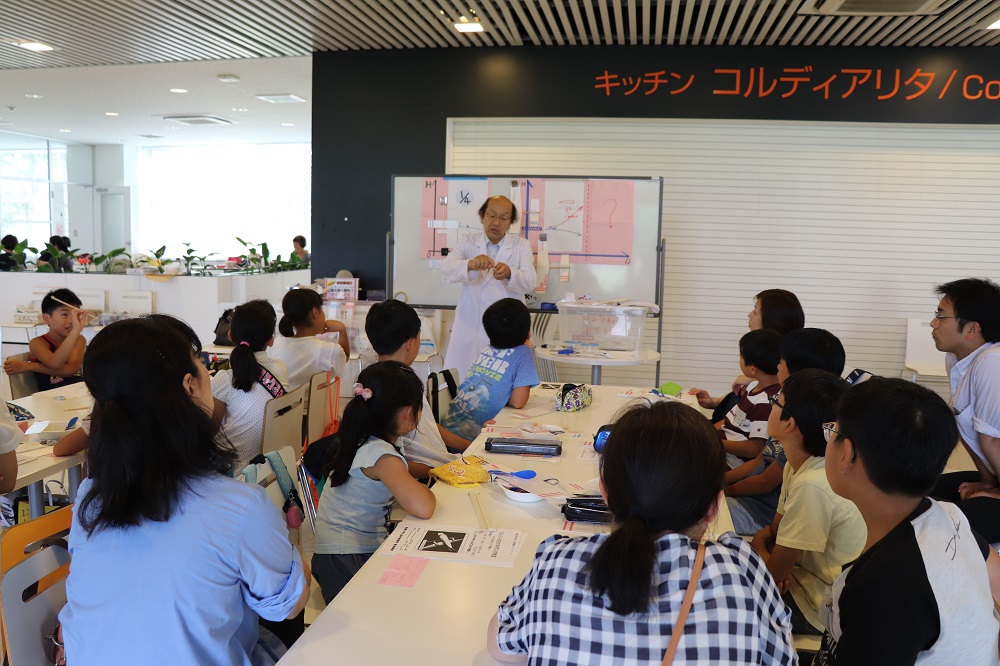 8月1日には「君の瞳がキラリと光る科学教室」を実施。千葉敬愛短期大学附属幼稚園の杉山清志園長が、身の回りにある道具やホームセンターで手軽に入手できる品物を使った5つの理科実験を紹介。炎の絵と手の摩擦熱でポップコーンを作るといった手品も登場した。