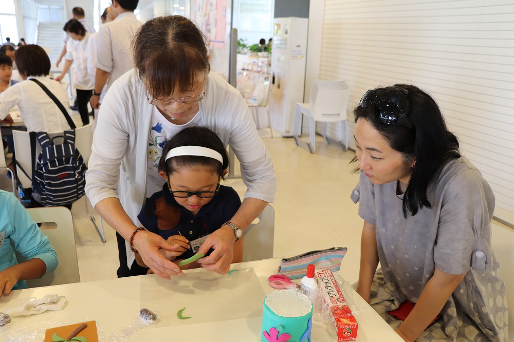 そのほか「子どものクレイクラフト」講座では、南国の海をイメージして貝のリースやプルメリアなどを粘土で作り、箱に飾り付けて鮮やかな色の宝箱を製作した。