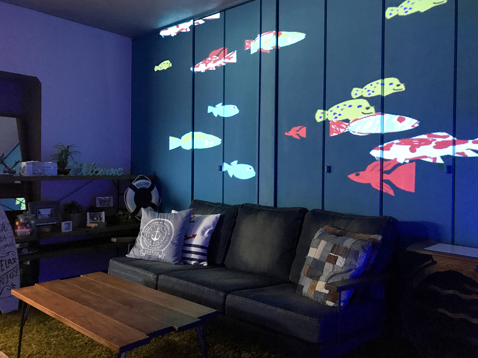 芝浦工業大学 — 学生団体制作のプロジェクションマッピングでレンタルスペースにアクアリウムが出現 ~自分でペイントした魚が泳ぐ空間を演出~