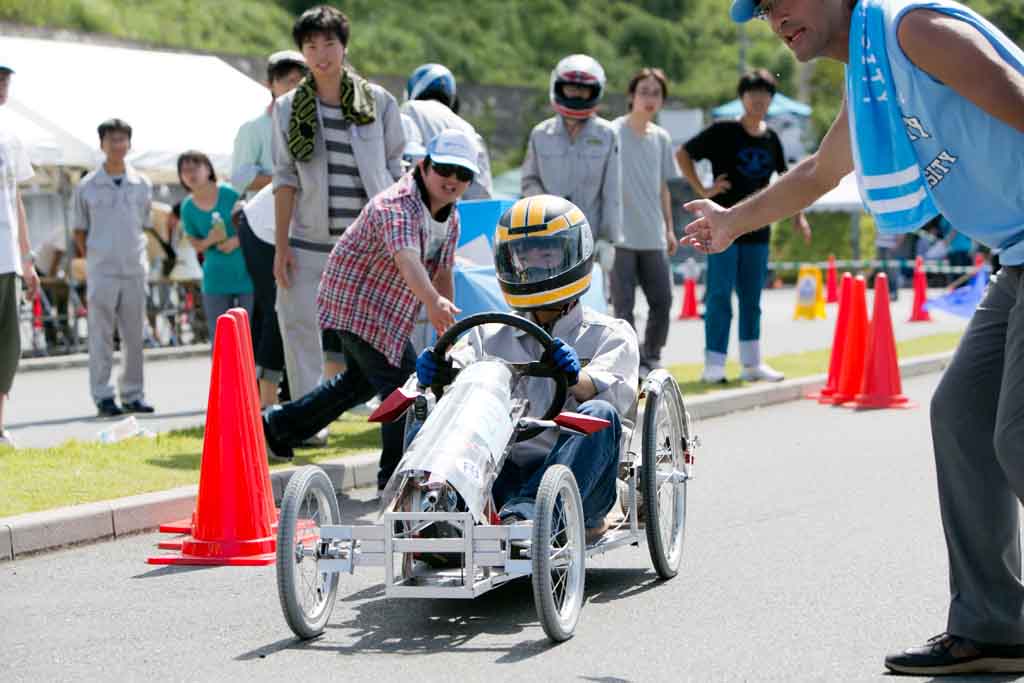 同コンテストは、中高生が自作した「電気自動車」に規定のバッテリー(原動機付自転車用)を搭載し、1周500mのコースを10周する走行タイムを競う。今年度は全20チームがエントリーし、各自が工夫を凝らした電気自動車で参戦する。年々参加チームの技術力が増しており、車両の軽量化をはじめ、流体力学対応のボディーデザインや伝動ロスの少ない駆動系統など、参加車両の随所に技術的な創意工夫がみられる。