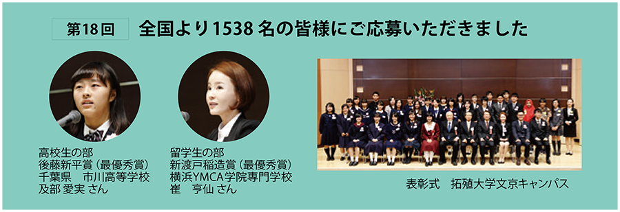 第19回を迎える当作文コンクールは、明治から大正にかけて、日本が国際社会に登場していく過程で重要な足跡を残した第三代学長後藤新平、第二代学監新渡戸稲造の精神を受け継ぎ、全国の高校生や外国人留学生を対象に「国際協力」「国際理解」「社会貢献」の重要性を広く伝え、グローバルに活躍できる人材の育成を目的に実施している。