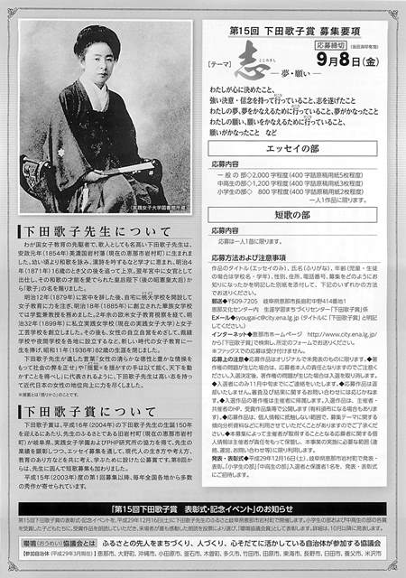エッセイ・短歌の公募賞「第15回下田歌子賞」。今年のテーマは「志(こころざし)―夢・願い―」。小学生、中高生、一般の3部に分け、エッセイ・短歌を募集。エッセイの部受賞者は学祖 下田歌子のふるさとである岐阜県恵那市で表彰・発表を行う。いずれも9月8日(金)締め切り。