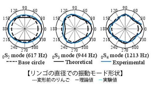 その結果、りんごの直径上の振動モード形状と固有振動数を得ることができ、非接触・非破壊でりんごの硬さを評価することに成功した。これにより、食べ頃や収穫時期を非接触・非破壊で全品検査することも可能となる。また、固有振動数の変化を捉えることで、貯蔵期間の経過に伴うりんごの硬さの推移を評価することにも成功した。