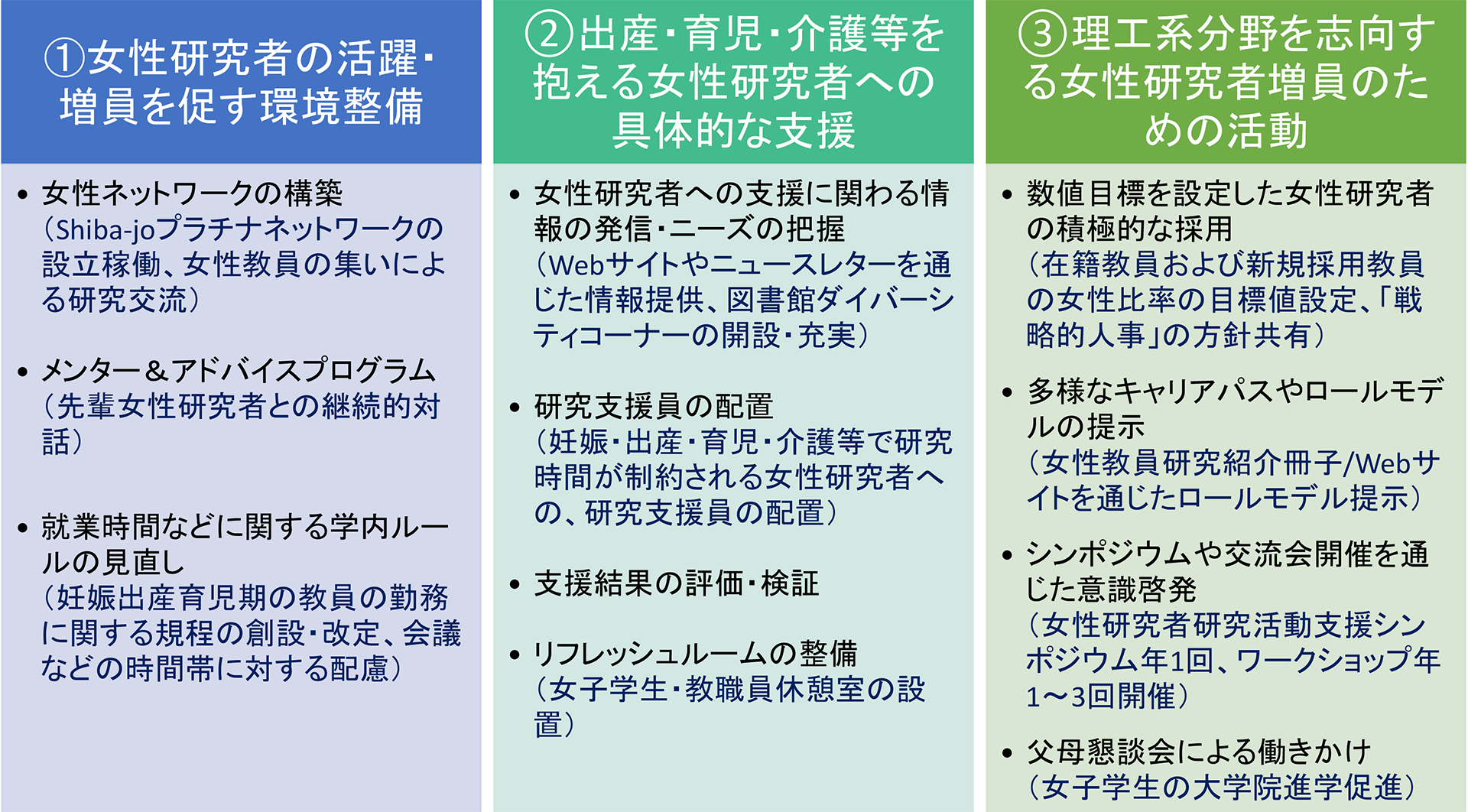 この3年間を通して、芝浦工業大学では、学長のリーダーシップのもと、全学体制で、女性ネットワークの構築、規程整備等「(1)女性研究者の活躍・増員を促す環境整備」、研究支援員の配置をはじめとする「(2)出産・育児・介護等を抱える女性研究者への具体的な支援」、数値目標を設定した女性研究者の積極的な採用をはじめとする「(3)理工系分野を志向する女性研究者増員のための活動」に取り組んできた。