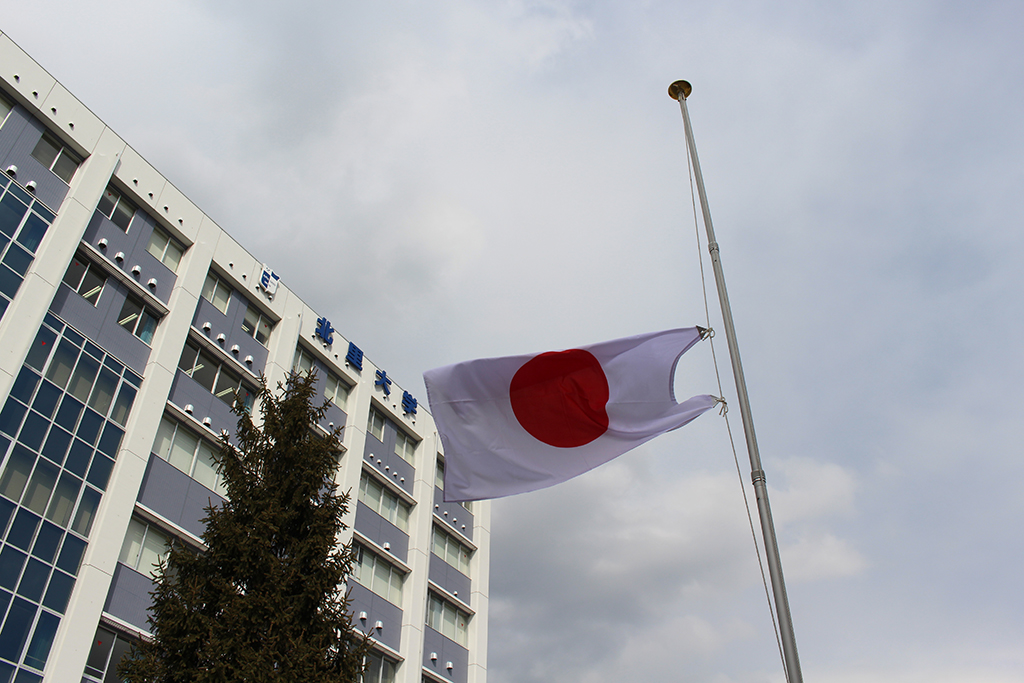 北里大学が半旗を掲揚し、東日本大震災による被災者を追悼