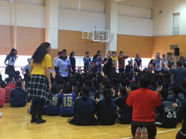 そのような背景の中、近年多くの小、中学校や高校で法人開催が行われている。2~3日のフルワークショップが難しい場合は、1日の体験ワークショップもある。今回、明星学苑では明星高校の1年生約340名だけを対象として、1日の体験ワークショップを2月16日に実施した。当日は、3時間に凝縮したプログラムだったにもかかわらず、全員が見事にヤングアメリカンズの世界に引き込まれ、非常に盛り上がった。(写真参照)
