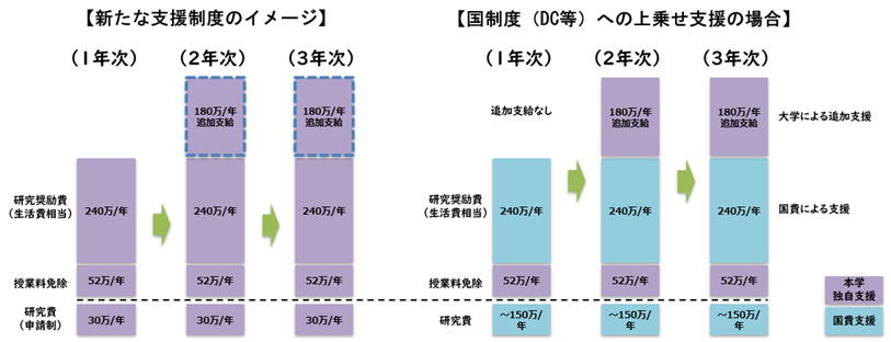 本プロジェクトでは、一定の資格要件を満たす学生全員(※1)を対象に、生活費相当額(年額240万円)を支給するとともに、授業料免除等の支援を行うことで、研究に専念できる環境を提供します。さらに、研究業績の優れた学生(※2)に対しては、2年次以降給付額を上乗せすることで、授業料免除と合わせて同世代の社会人の給与と同水準の支援(※3)を行います。