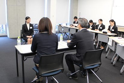 複数および個人の模擬面接を通して面接・採用担当者の視点を理解し、就職活動に生かす。1教室5名程度で、30教室を予定。内定を獲得した4年生が「就活サポーター」として各教室をサポートする。