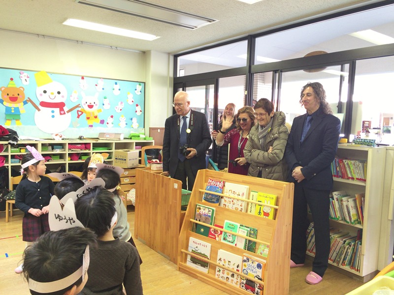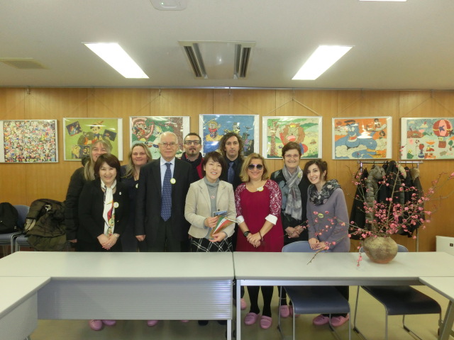 リモーネ市の英語教育視察団は、ブレシア県教育長、学校長、文科省コンサルタント、小学校英語教諭、市職員の全7名。1月16日~20日にわたり、PLSの指導方式を用いる長野県と東京都の小学校・幼稚園などの視察を日本のPLSと共同で行った。