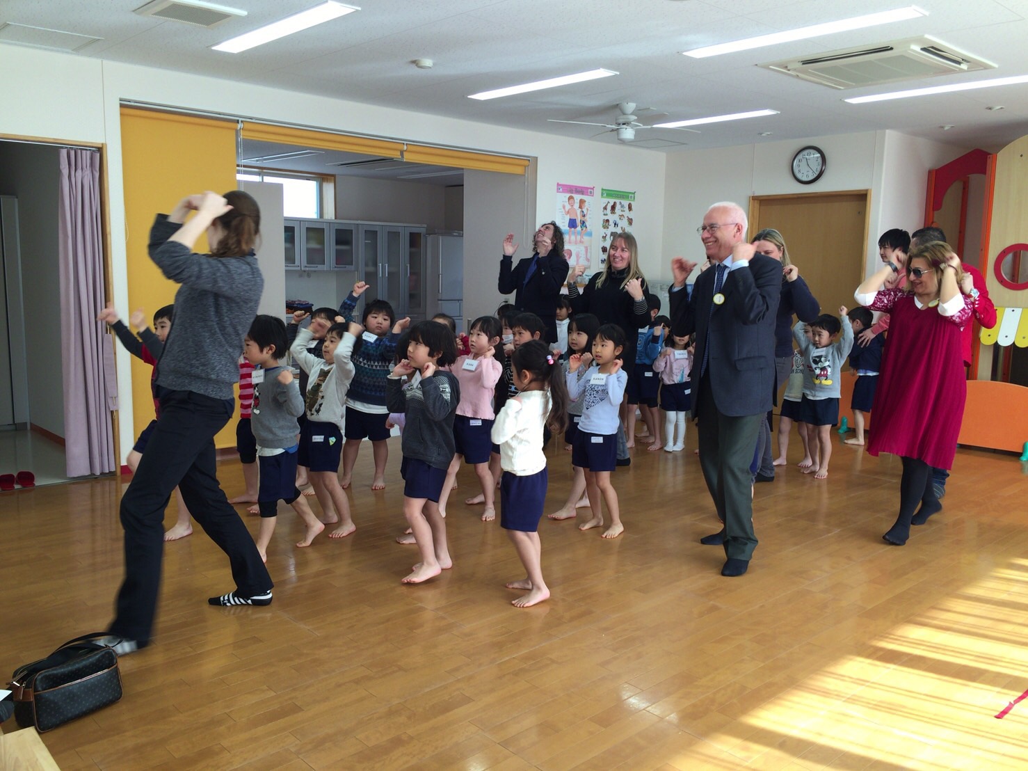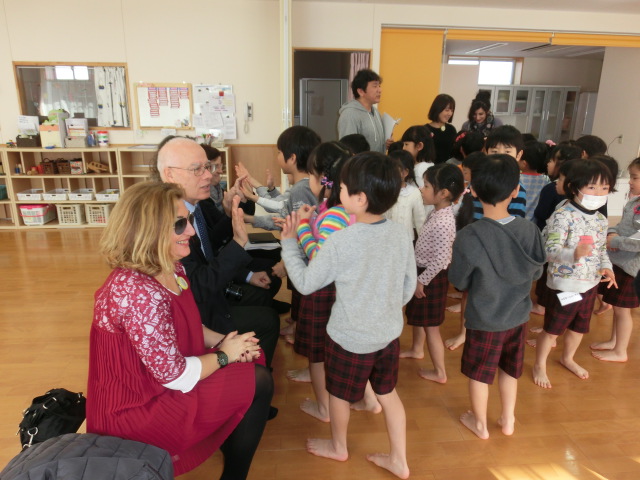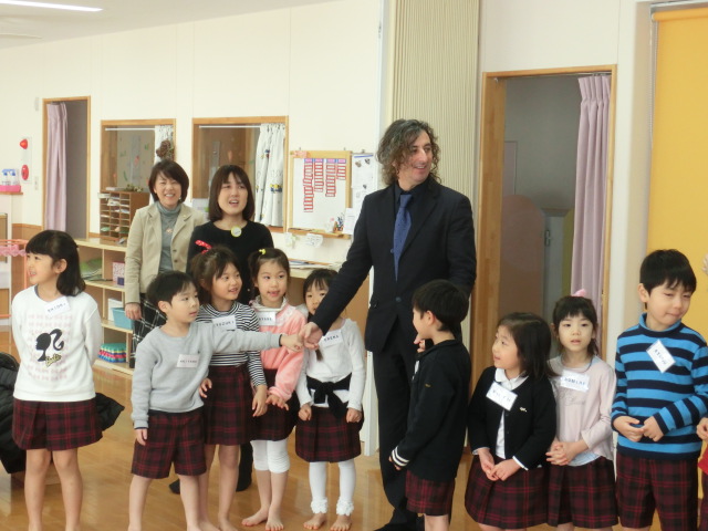 今回の視察では、子どもたちがネイティブの先生の英語をよく理解し、よく反応している姿が印象的で、授業の最後に「ありがとうございました」ときちんとお礼を言う日本の習慣や礼儀正しさに驚いたという。子どもたちは、事前に担任から教わった「ボンジョルノ」「チャオ」などのイタリア語を使って挨拶し、視察団の方々とも自然に交流していた。視察団からは、リモーネ市の小学生からの絵手紙が手渡され、ドラえもんやポケモンの絵が描いてある手紙を見て、園児たちも感激していた。