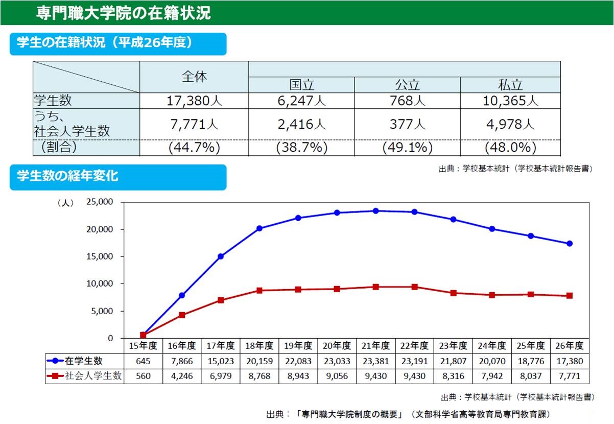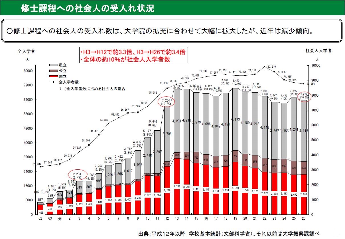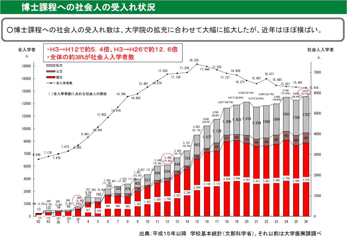 約20年間で大学院の在籍者数は約2倍となり、社会人の大学院への進学意欲も高まっている。文部科学省の「学校基本調査」によれば、2014年に大学院へ入学した社会人は約1万8000人で、大学院入学者全体の18.2%、そのうち博士課程の社会人入学者(2014年)は約5800人で37.7%を占めている。理工系の研究科の入学者が多いが、専門職大学院では社会人が約4割を占めるなど、「社会人の学び直し」についてのニーズは高くなっている。しかし、仕事をしながら大学院へ通うのは時間的に難しいケースが多い。そこで、仕事のキャリアを積み、忙しさが一段落して定年を迎える前後の世代を対象に、シニア大学院生入試を始める大学が増えてきた。