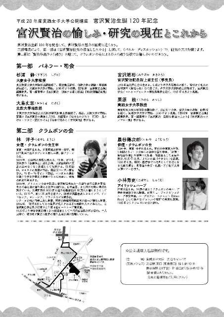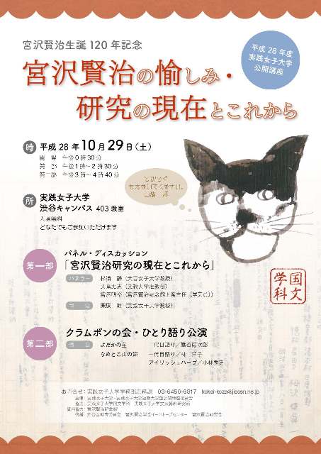 宮沢賢治生誕120年を記念して宮沢賢治の魅力の秘密に迫ります。二部構成により、第一部は「宮沢賢治研究の現在とこれから」と題して〈パネルディスカッション〉で、研究の未来を探ります。第二部は「賢治作品ひとり語り」と題して、クラムボンの会によるひとり語り講演です。