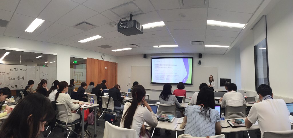 日本での研修は6月22日~24日に東京のTUJキャンパスと国際文化会館で行われ、米国大使館広報・文化交流部 文化交流担当官補ジェフ・アドラー氏から「留学交流の専門家として皆さんはこのビジョン(2020年までに日米学生交換を2倍にする)実現に向け重要な立場にある。この機会をぜひ有効活用してほしい」という激励の言葉を受けて始まった。 日米大学の運営組織の比較などについて学長ブルース・ストロナクはじめTUJの教職員から講義を受け、昭和女子大学理事長の坂東真理子氏による「日本の大学の国際化の現状と課題について」の基調講演のほか、4つの別分科会では「教務」「学生サービス&カウンセリング」「入学選考」「就職/インターンシップ」というテーマについて、TUJの実務担当者と現場の声を共有した。