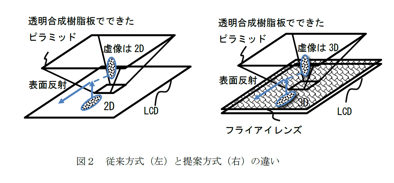 そこで神奈川工科大学のグループは、LCDとピラミッドとの間にフライアイレンズ(蝿の目レンズともいう)を介在させることで、立体写真技術であるインテグラルフォトグラフィ(IP)方式の裸眼立体表示ができるようにした。これにより、IPで生成された3D映像が透明樹脂板(アクリル製)で反射されて観察者の目に届くので、ピラミッド内に浮かんで見える像も2Dではなく3Dになる。