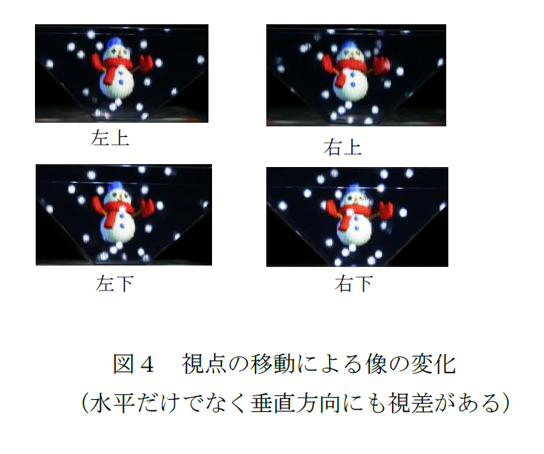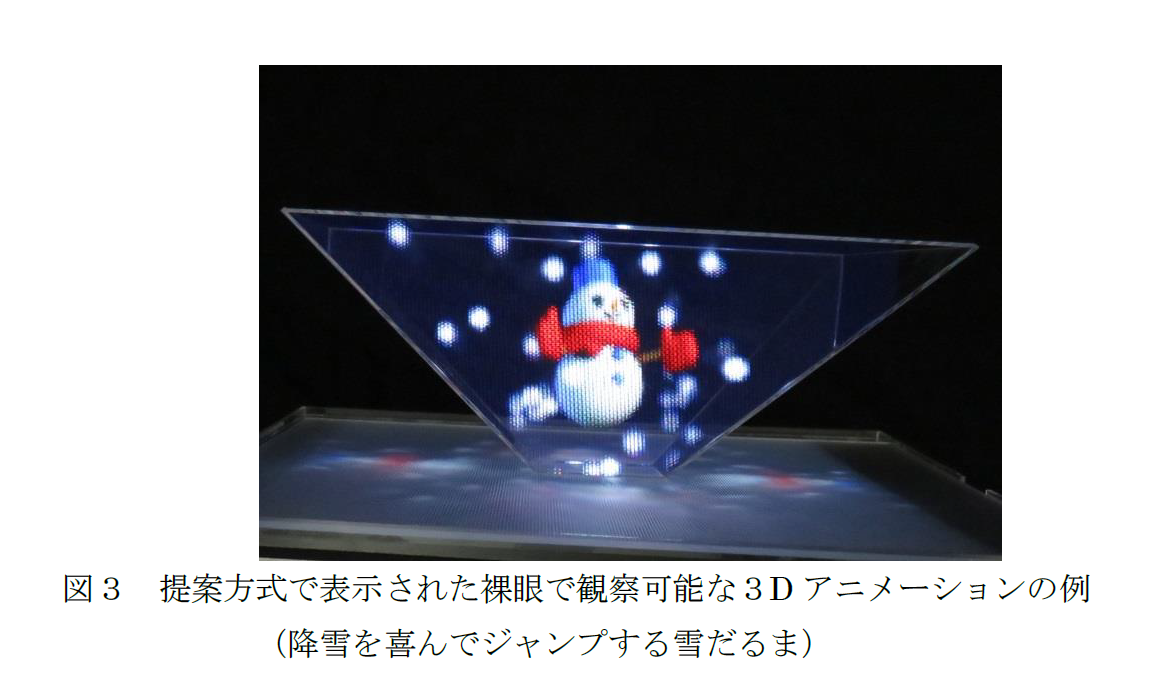 同グループはこの方式の有効性を確認するため、雪だるまが降雪を喜んでジャンプしているようなアニメーション作品を制作した。従来方式だと、ピラミッド内に浮かんで見える映像自体は平面的であり奥行き感が得られないが、この方式では映像自体が3Dなので、雪だるまの手前や奥も含むピラミッド全体に雪を降らすような表示ができる。従って、遠近感による臨場感を伴う3D映像表示が可能になる。しかもIP方式なので、水平方向だけでなく垂直方向にも視差が得られ、さまざまな方向から見ても立体感を感じることができる。