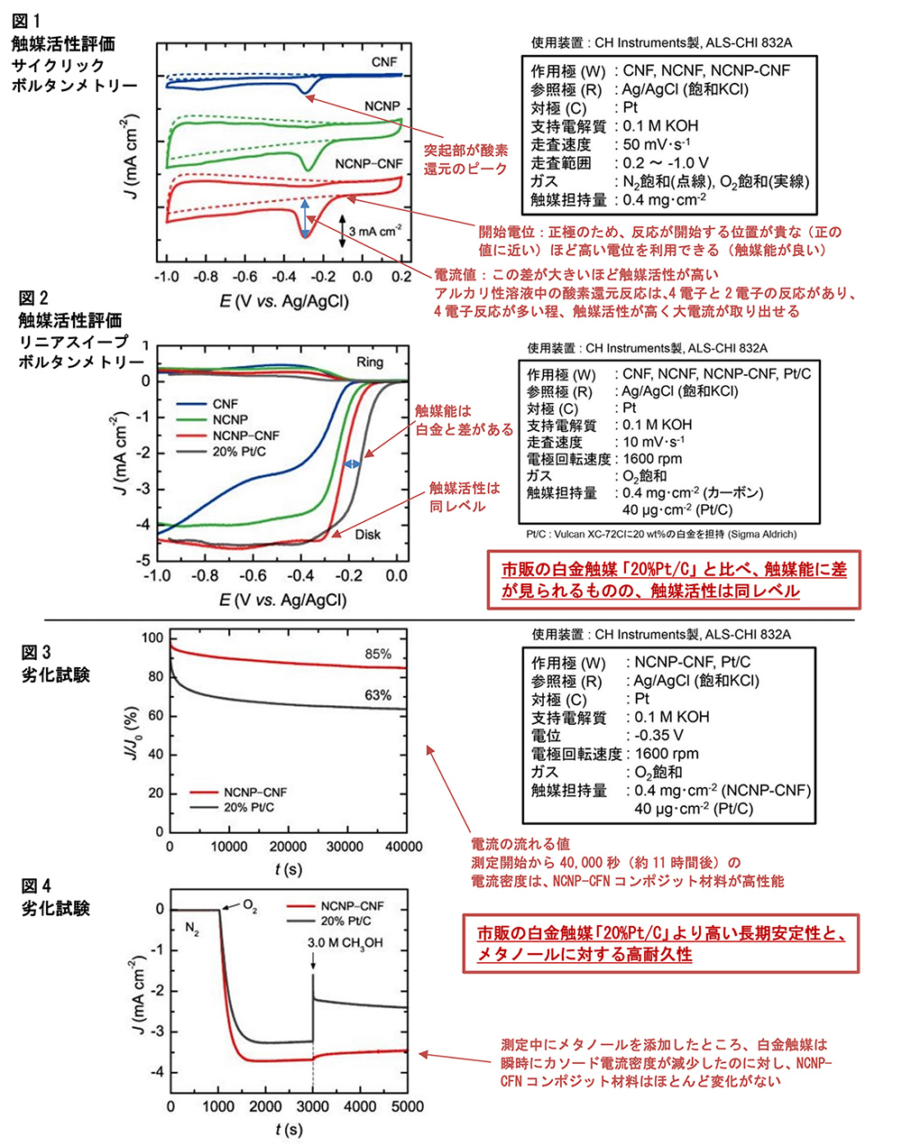 (1)白金担持カーボンと比較し、触媒能(電位)に差はあるものの、触媒活性(電流値)は同等レベル ※別添図1、2参照