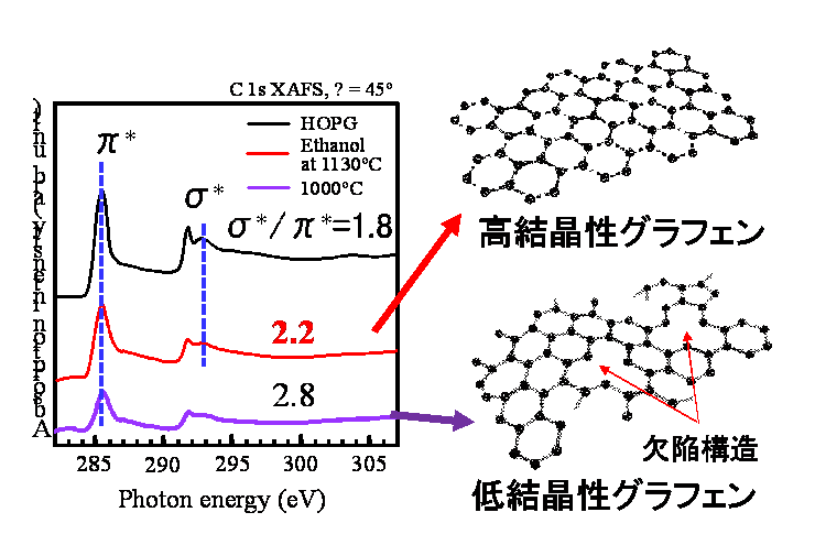 本研究グループは、1-3層(厚さ:~1nm)からなる極めて薄い酸化グラフェン薄膜をデバイス基板上へ塗布し、エタノール添加ガス雰囲気で1100℃以上の高温加熱還元処理を行うことにより(図1(b))、高移動度の薄膜形成に成功した。還元処理をしたグラフェン薄膜における電気伝導度の温度特性解析から、バンド伝導が観察された。低結晶性を示す低温(900℃)でのエタノール還元処理では、電子の流れ(図1(e)のグラフ: Y軸)は観察温度Tの-1/3乗(X軸)に対して線形に変化しており、この振る舞いはホッピング伝導モデルで説明することができる。一方、高結晶性を示すグラフェン薄膜が生成される高温条件(1130℃)では、観察温度が室温から40Kの範囲で伝導度(図1(f)のグラフ: Y軸)がTの-1/3乗に対して非線形的変化を示し、バンド伝導モデルで説明することができる。これは、カーボン原材料となるエタノールガスの添加により、酸化過程で生成した欠陥構造の修復が効率的に促進し、グラフェンの結晶性が飛躍的に向上していることを意味している。実際、バンド伝導の発現を裏付けるデータとして、X線吸収微細構造スペクトル※8を実施して電子構造※9の視点からもこの物性を実証した(図3)。さらに、ミクロ領域の構造解析法である透過型電子顕微鏡※10観察からも、結晶性の向上を明らかにした(図4)。